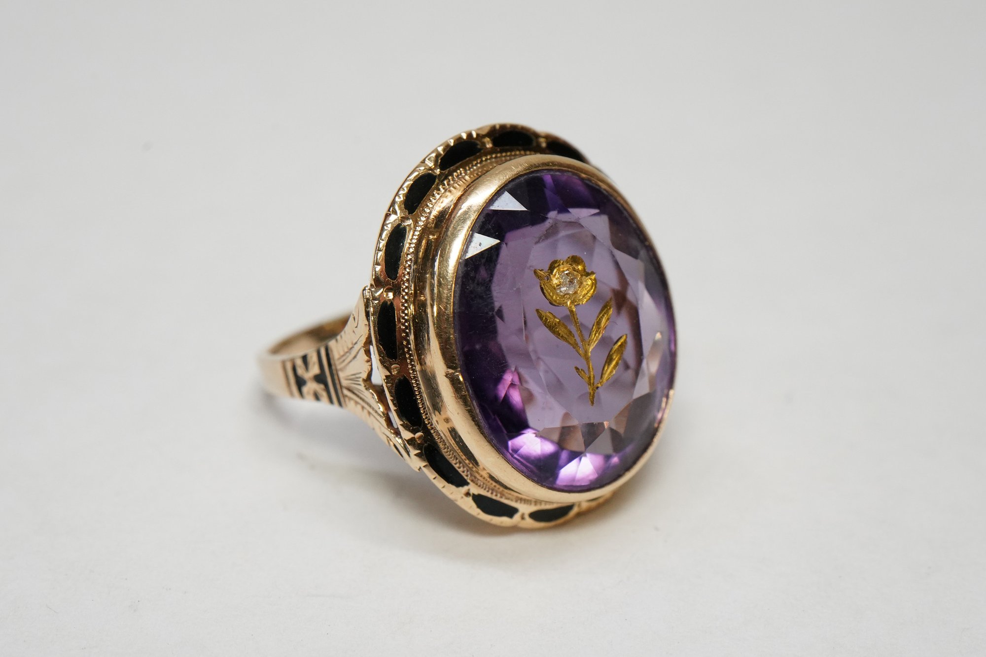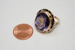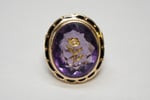 - Features ~15mm by 18mm faceted amethyst with pure gold amalgam encrusted flower, set with small rose-cut diamond.