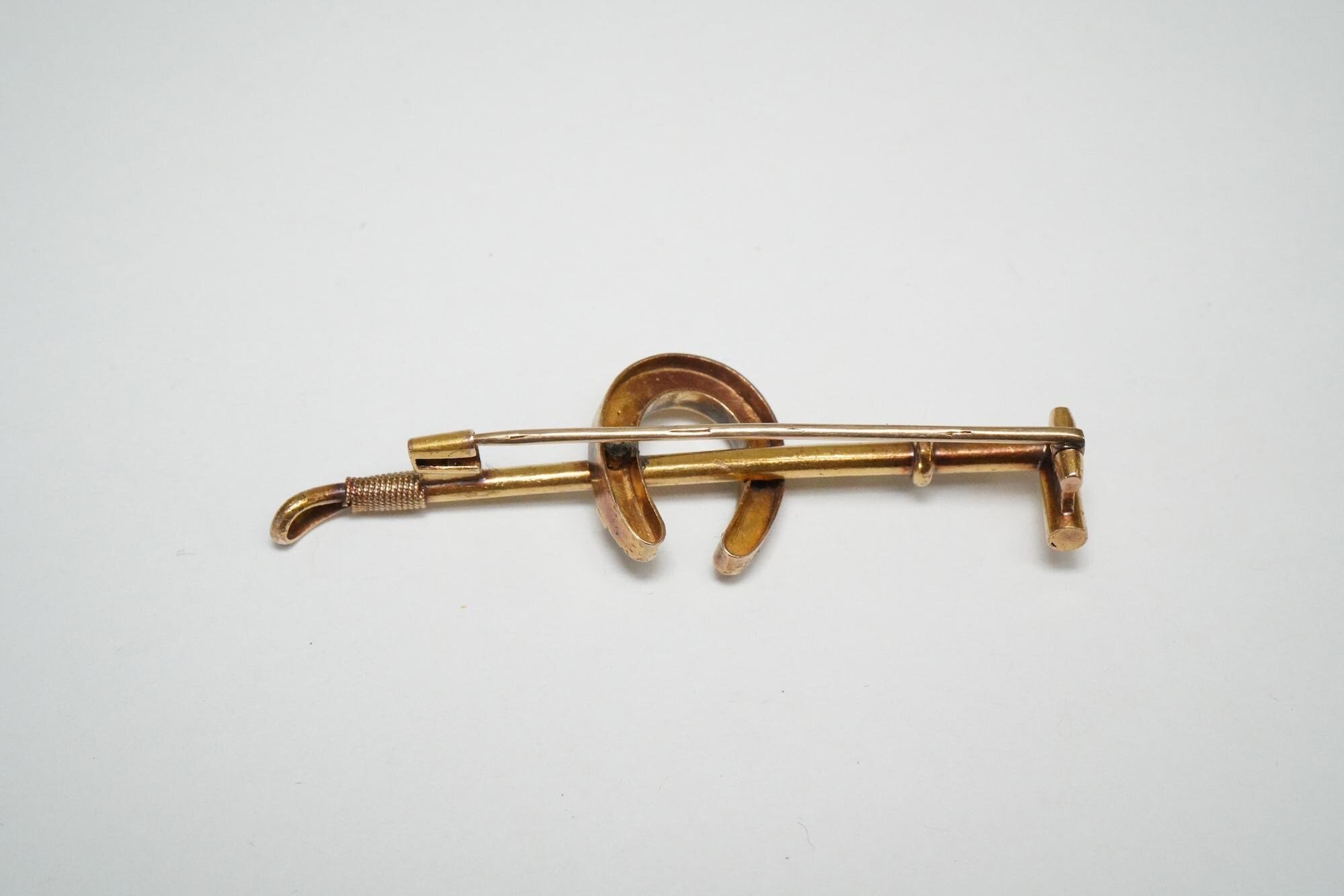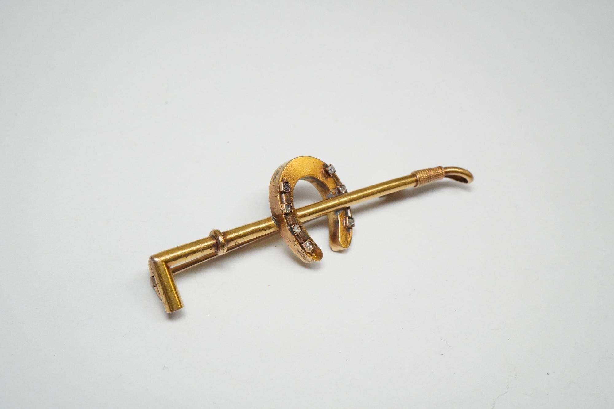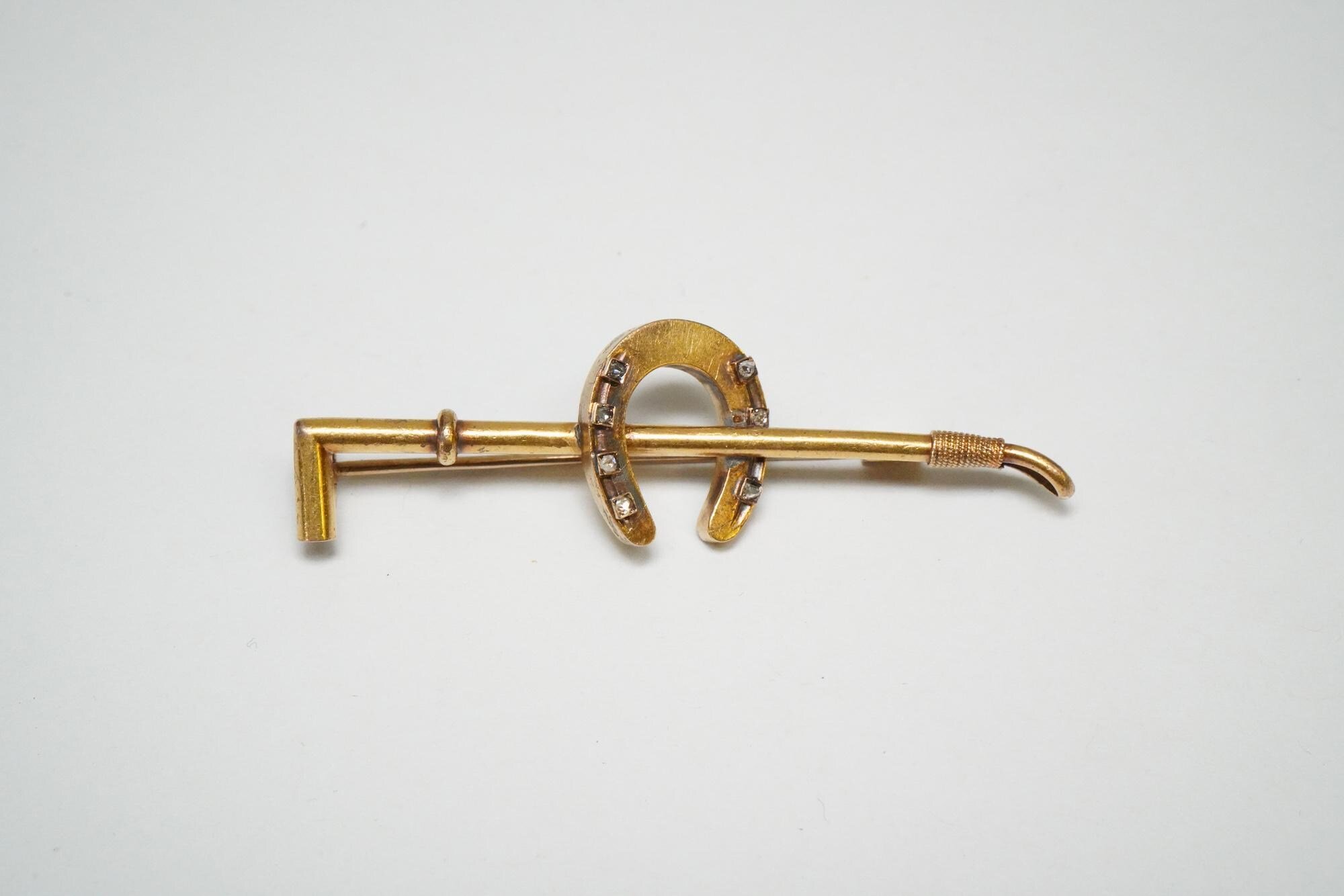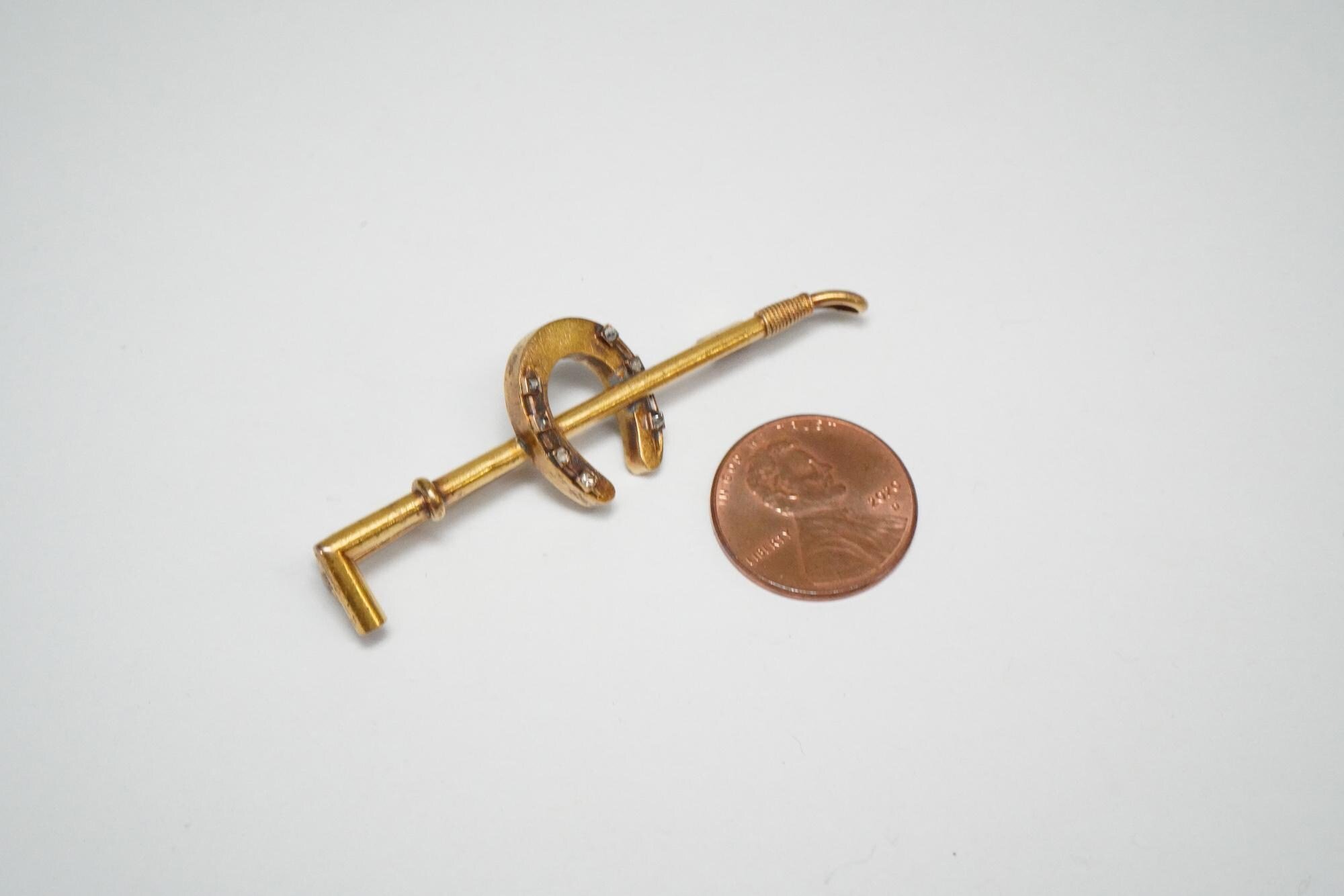 Original product name: Antique 14kt Gold Equestrian, Horseshoe and Crop Bar Pin - Truly Exquisite Patina - Good Luck - Seven Nail Horseshoe