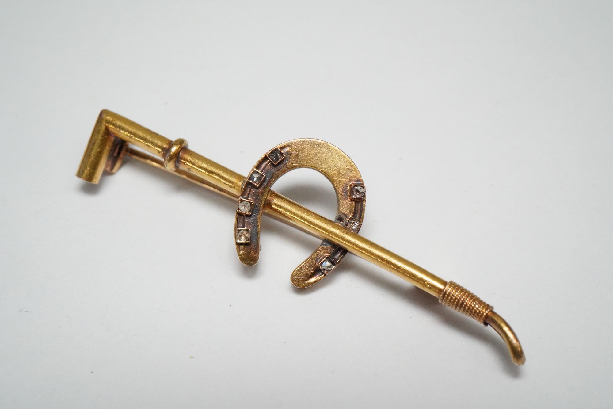 Antique 14kt Gold Equestrian, Horseshoe and Crop Bar Pin - Truly Exquisite Patina - Good Luck - S...
