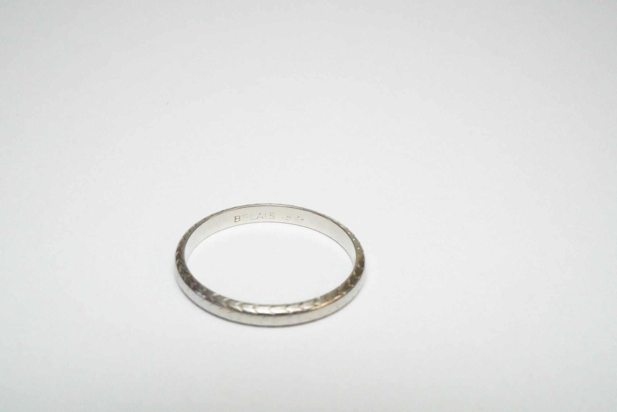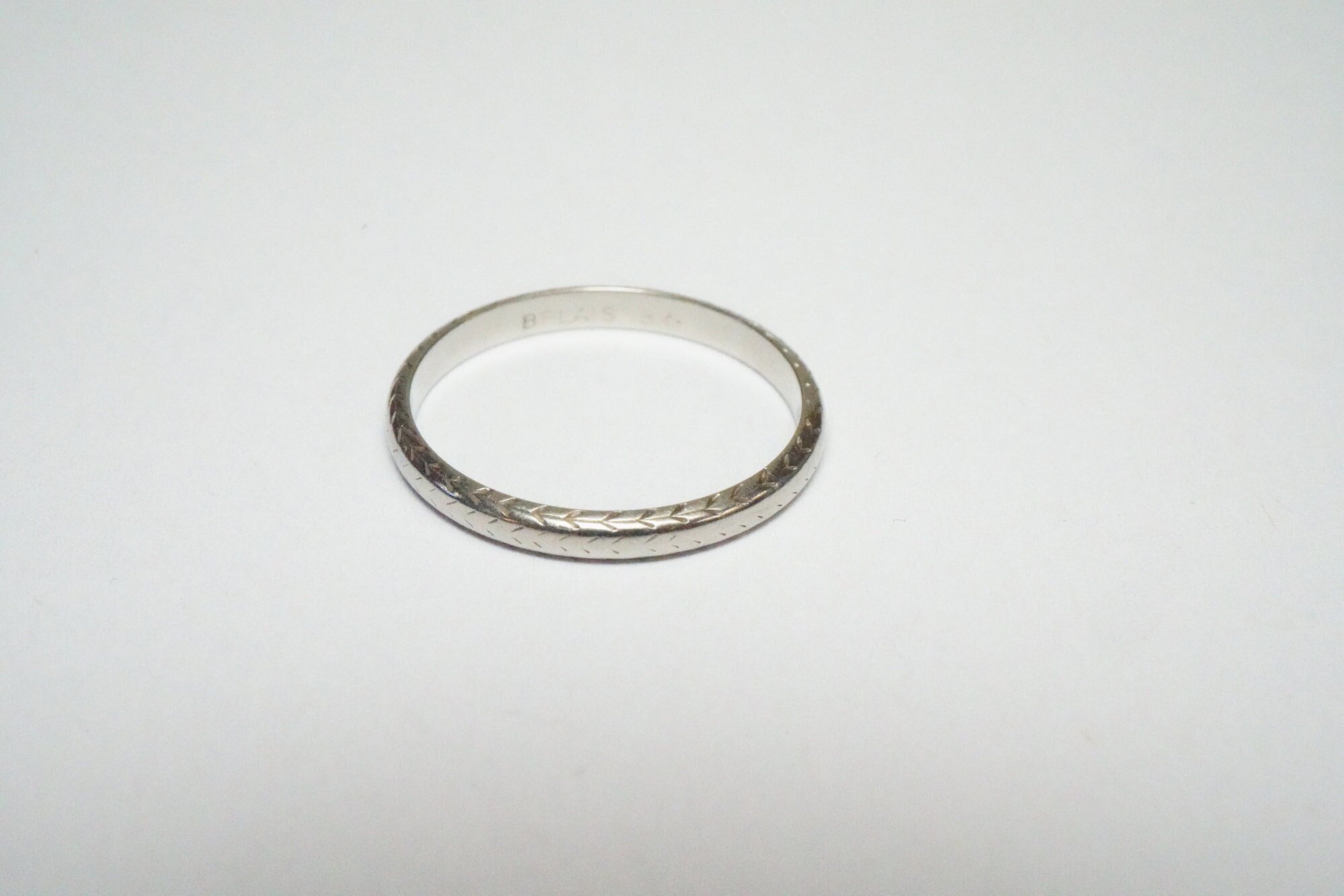 Notes - This ring was made by Belais - the first to patent white gold. It's in good antique condition with much of the engraving still intact after all these years.