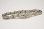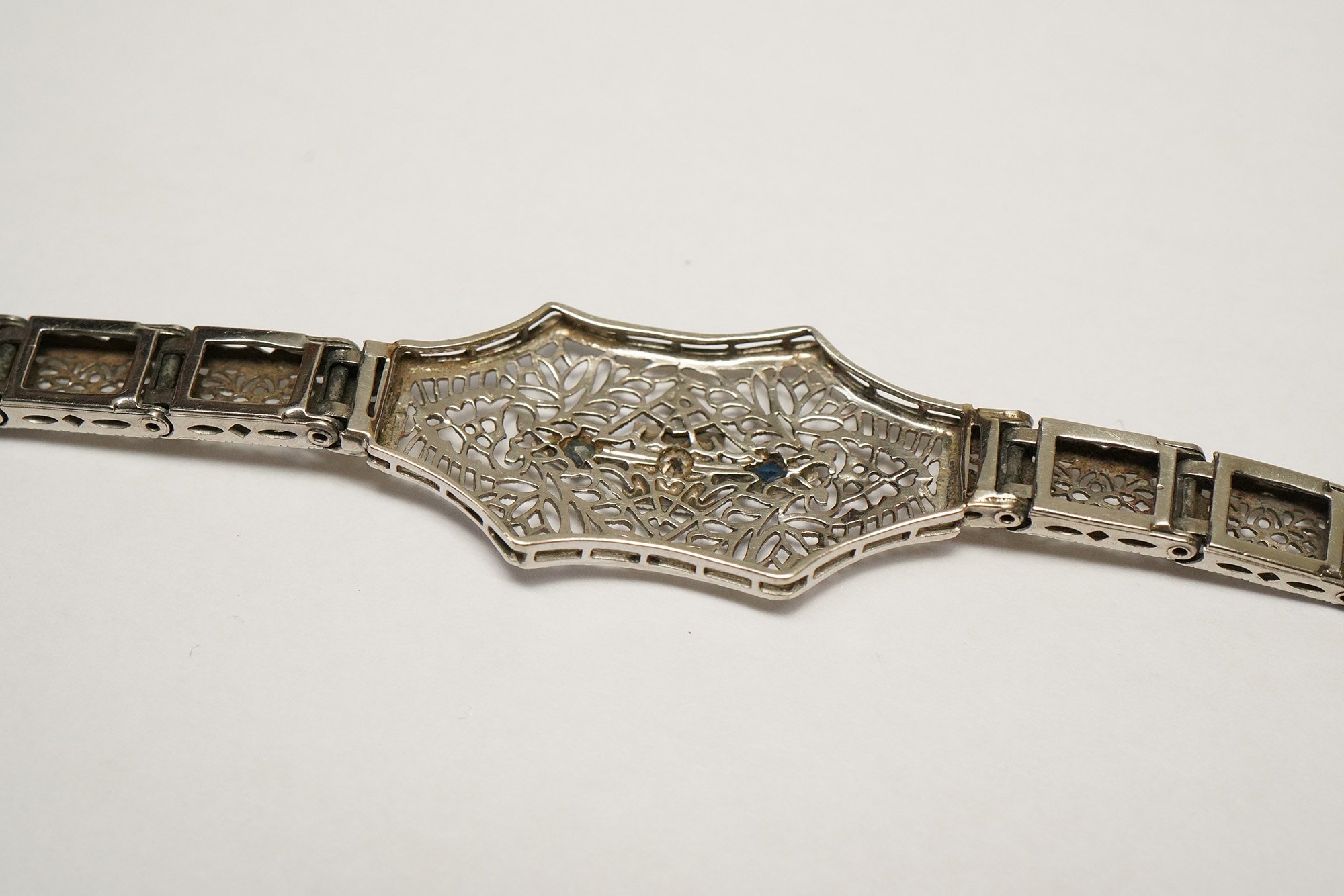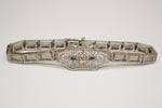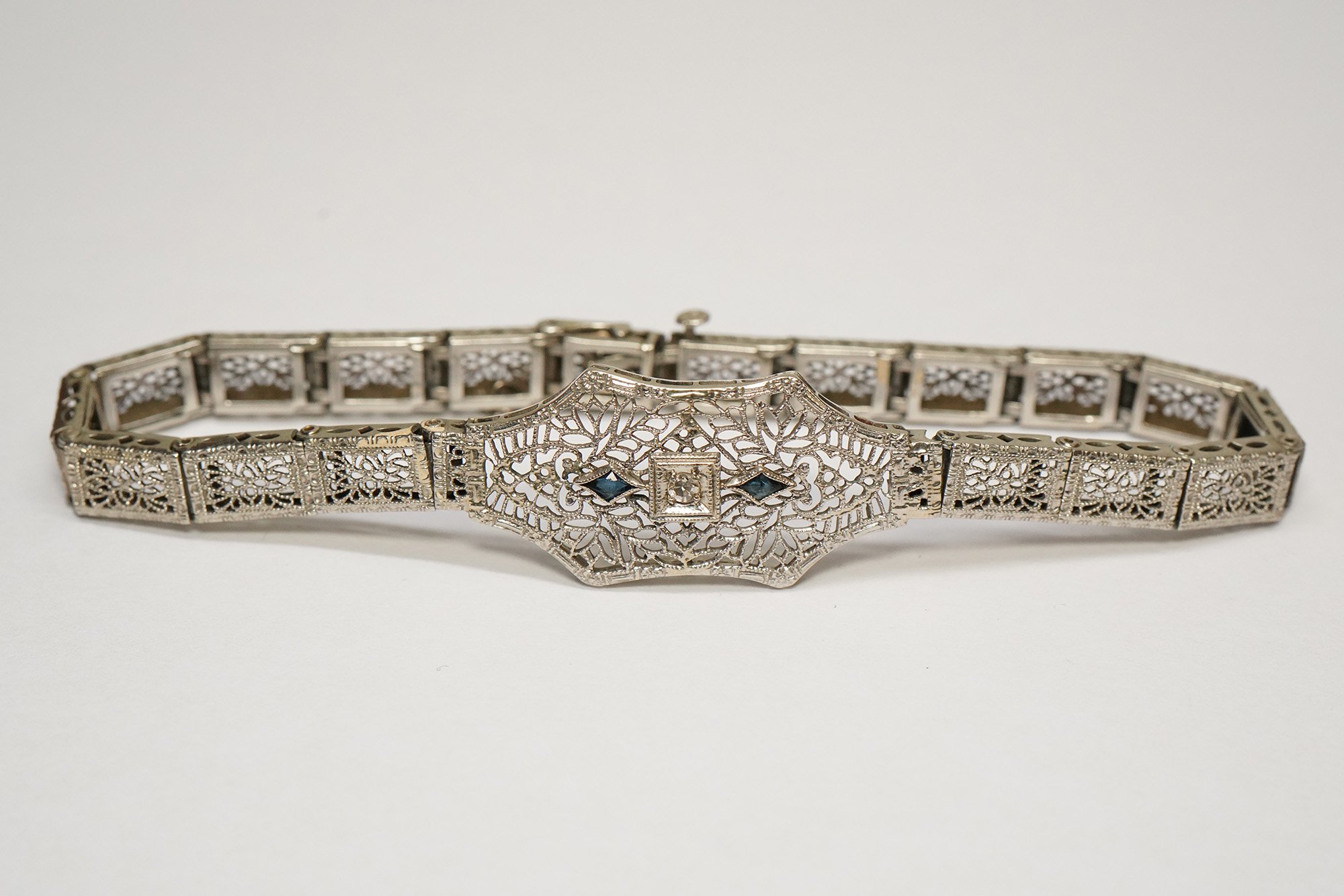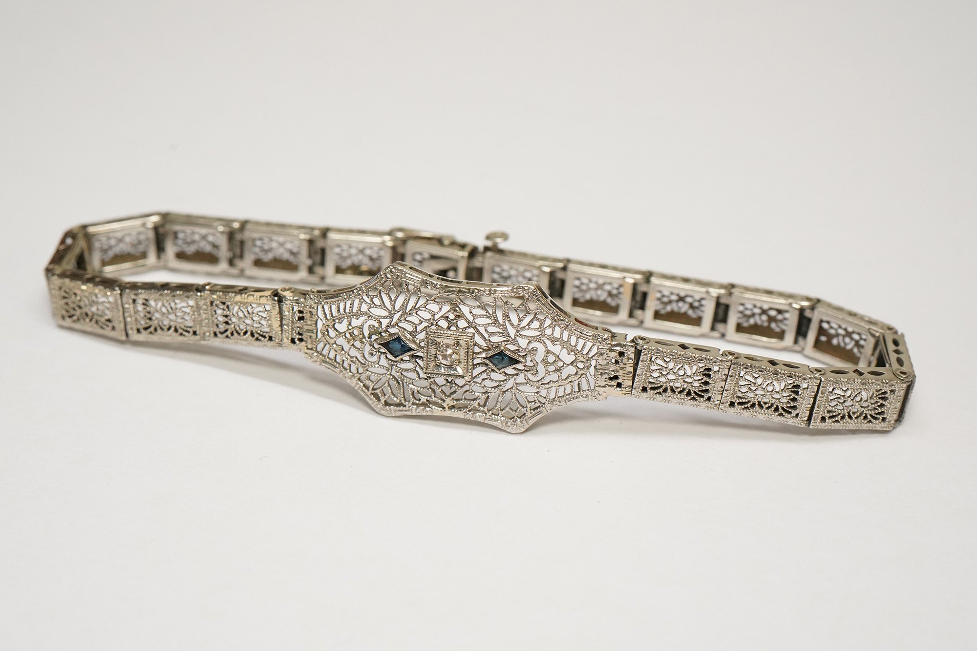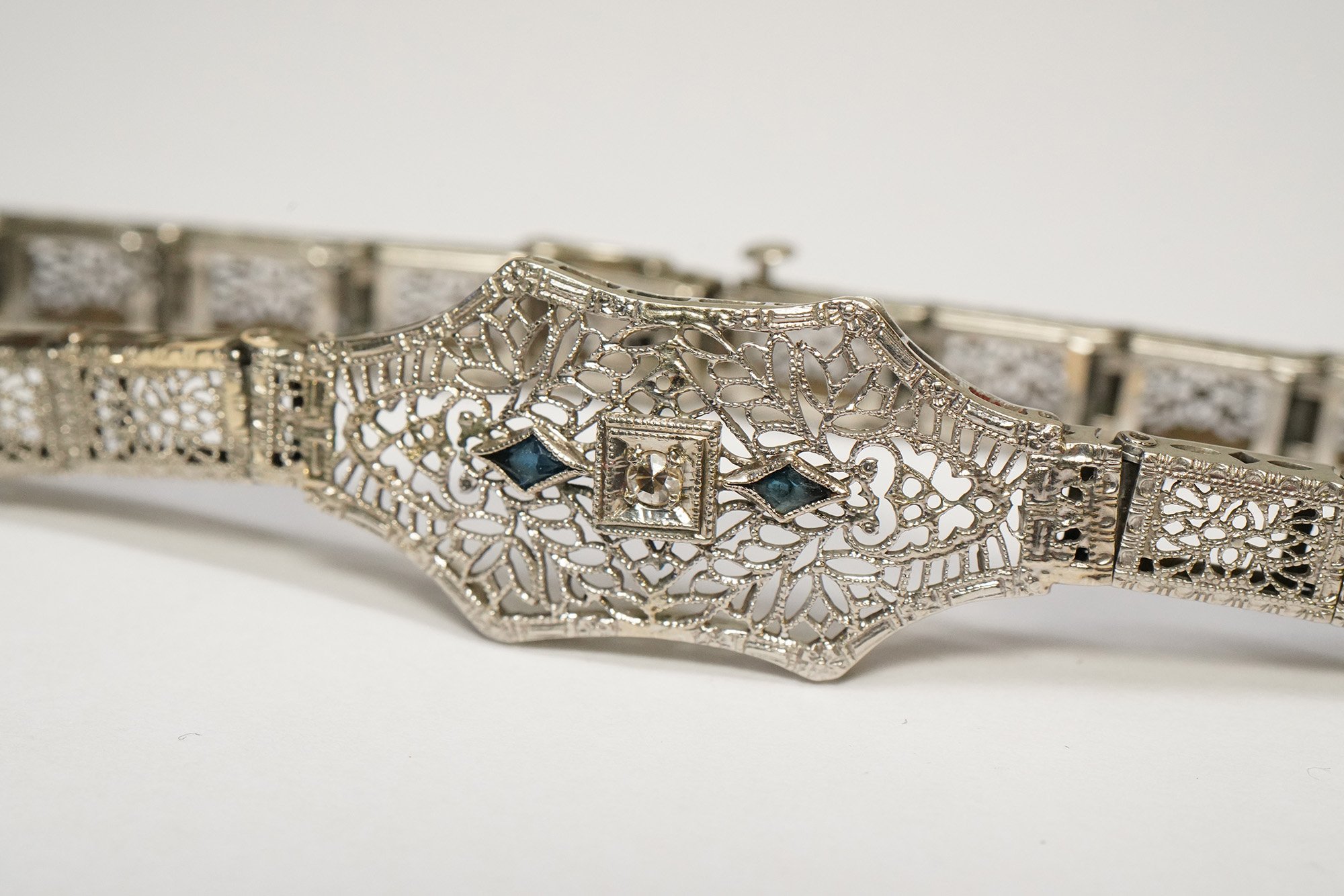 Art Deco 10k White Gold Filigree Link Bracelet with Diamond and Sapphires