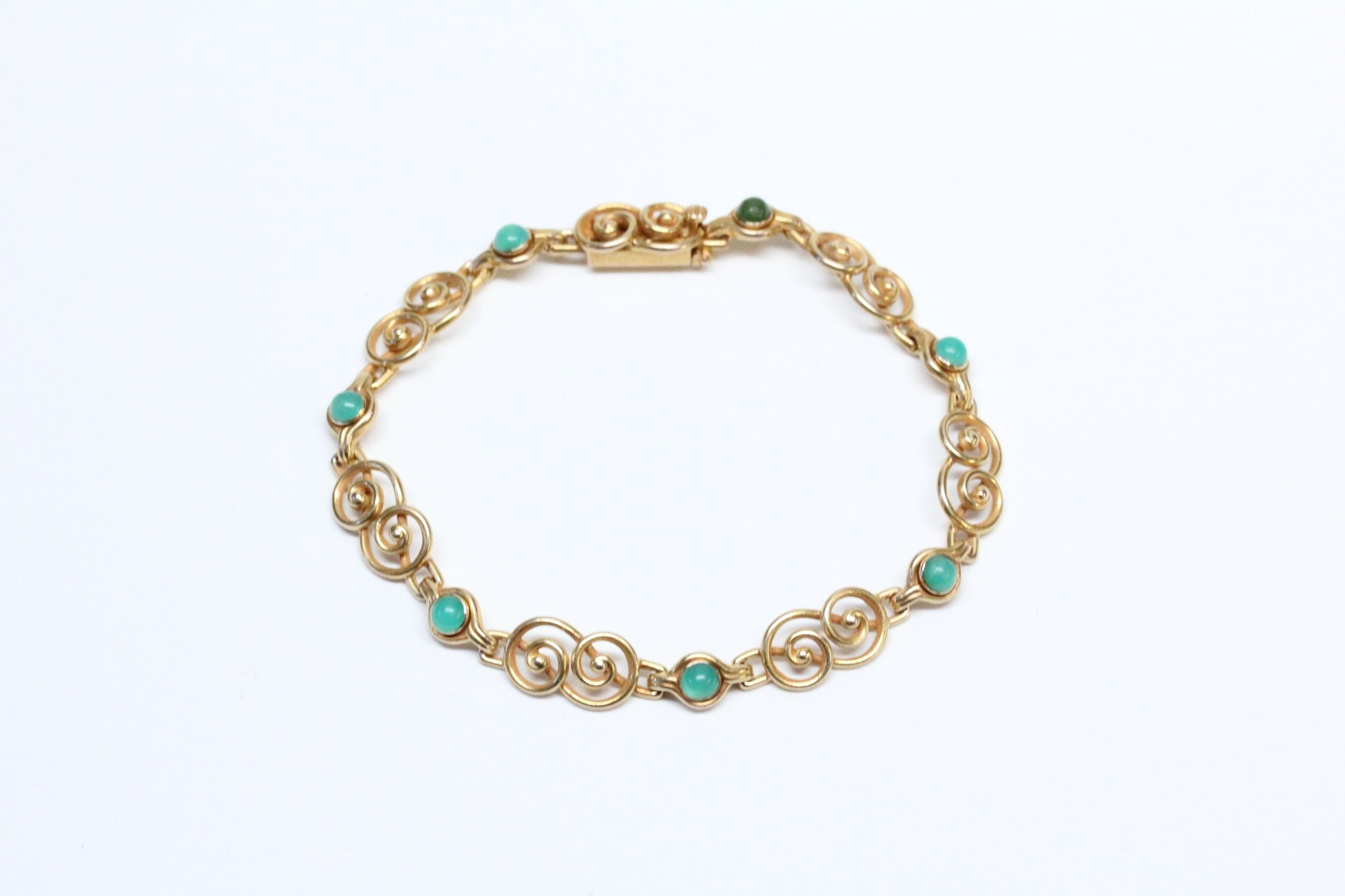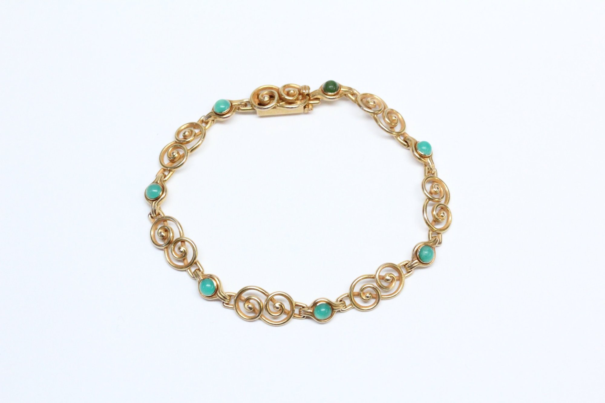 Original product name: Art Deco 14k Gold, Chrysoprase Fancy Link Bracelet - Exquisite Quality and Design - Integrated Clasp - Lovely Condition