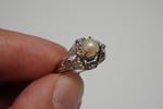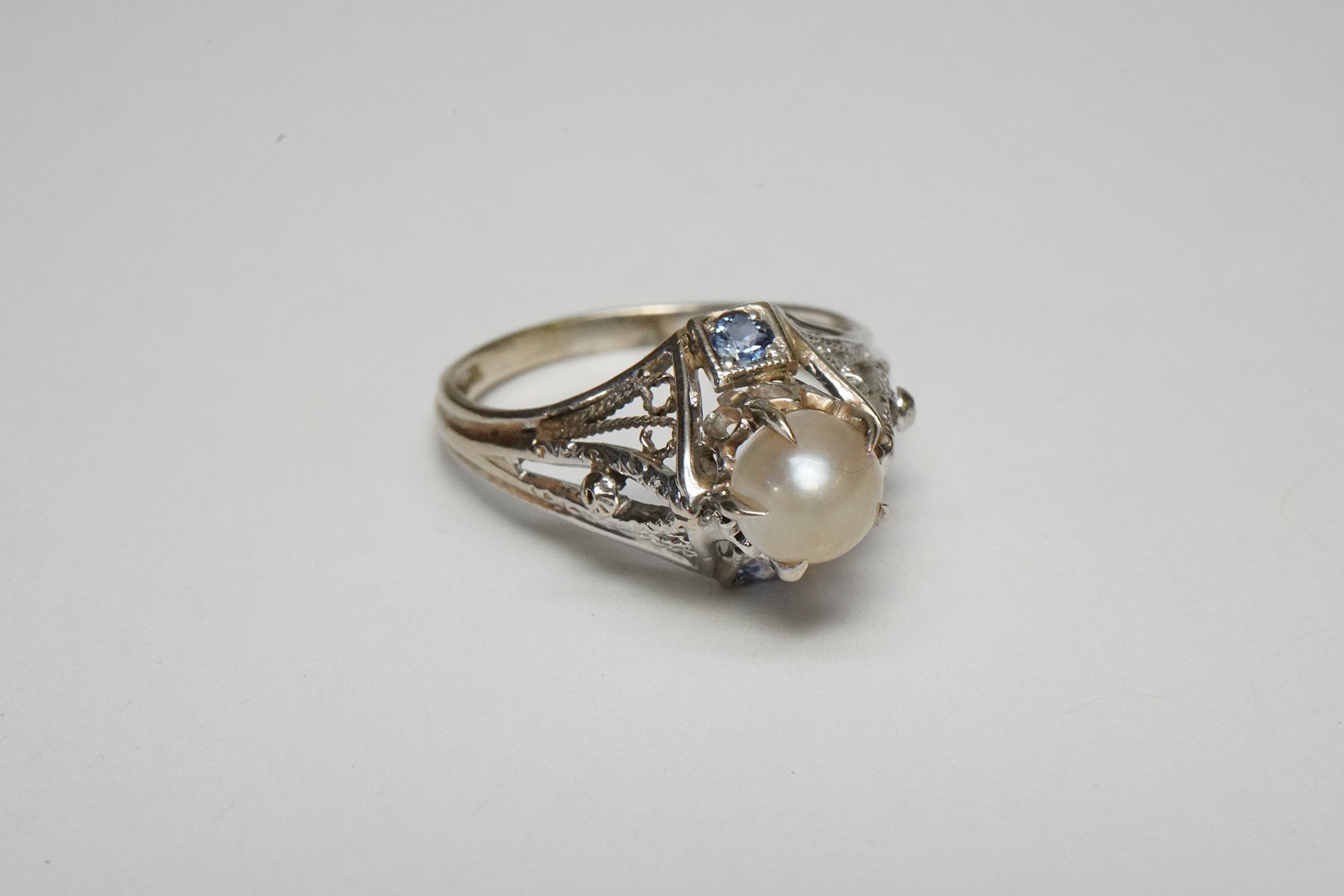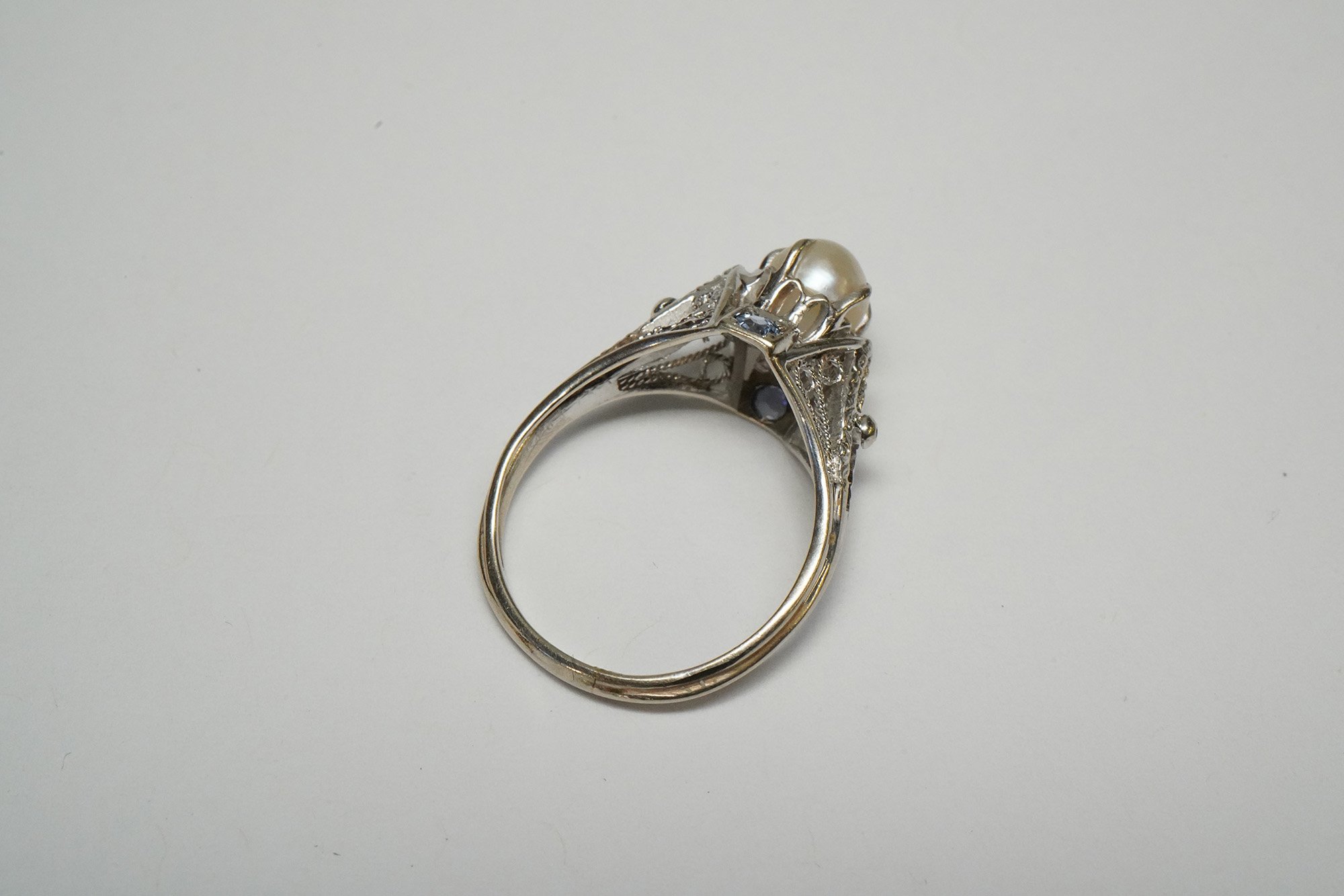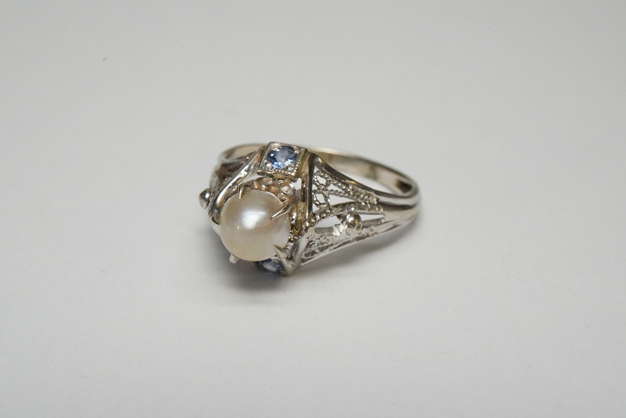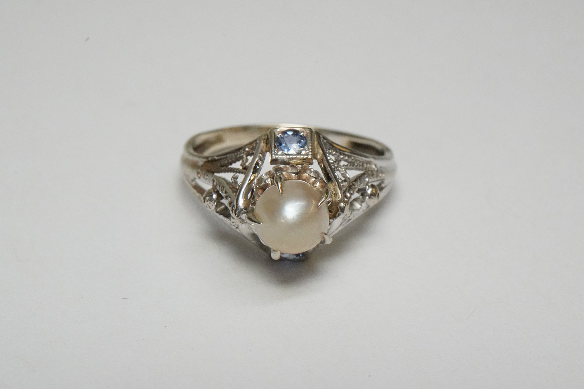Art Deco 14k White Gold, Pearl, and Sapphire Filigree Ring