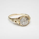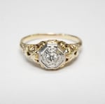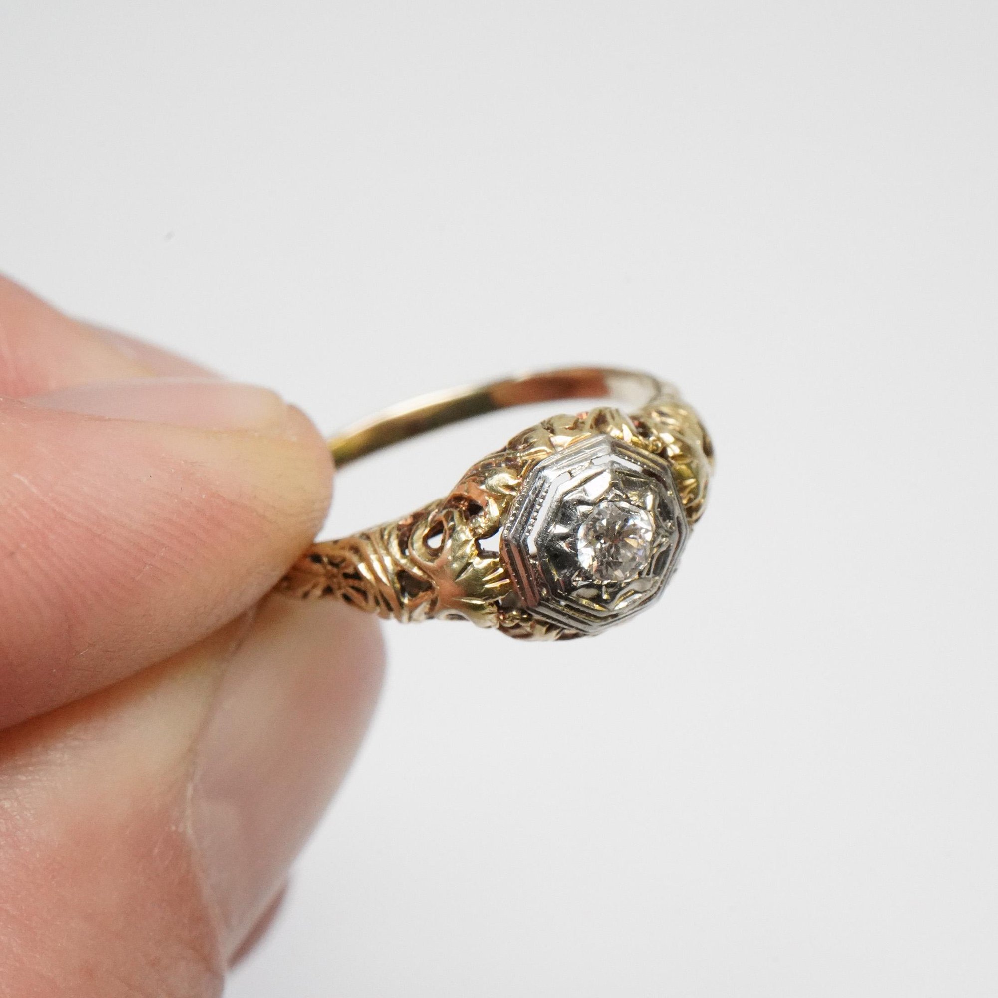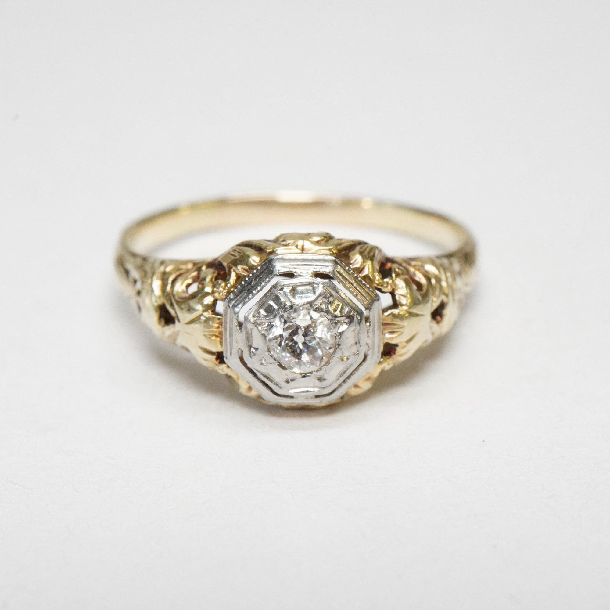 Art Deco 14k Yellow Gold, Diamond Filigree Ring - ~.08 Carat Old European Cut Diamond Center