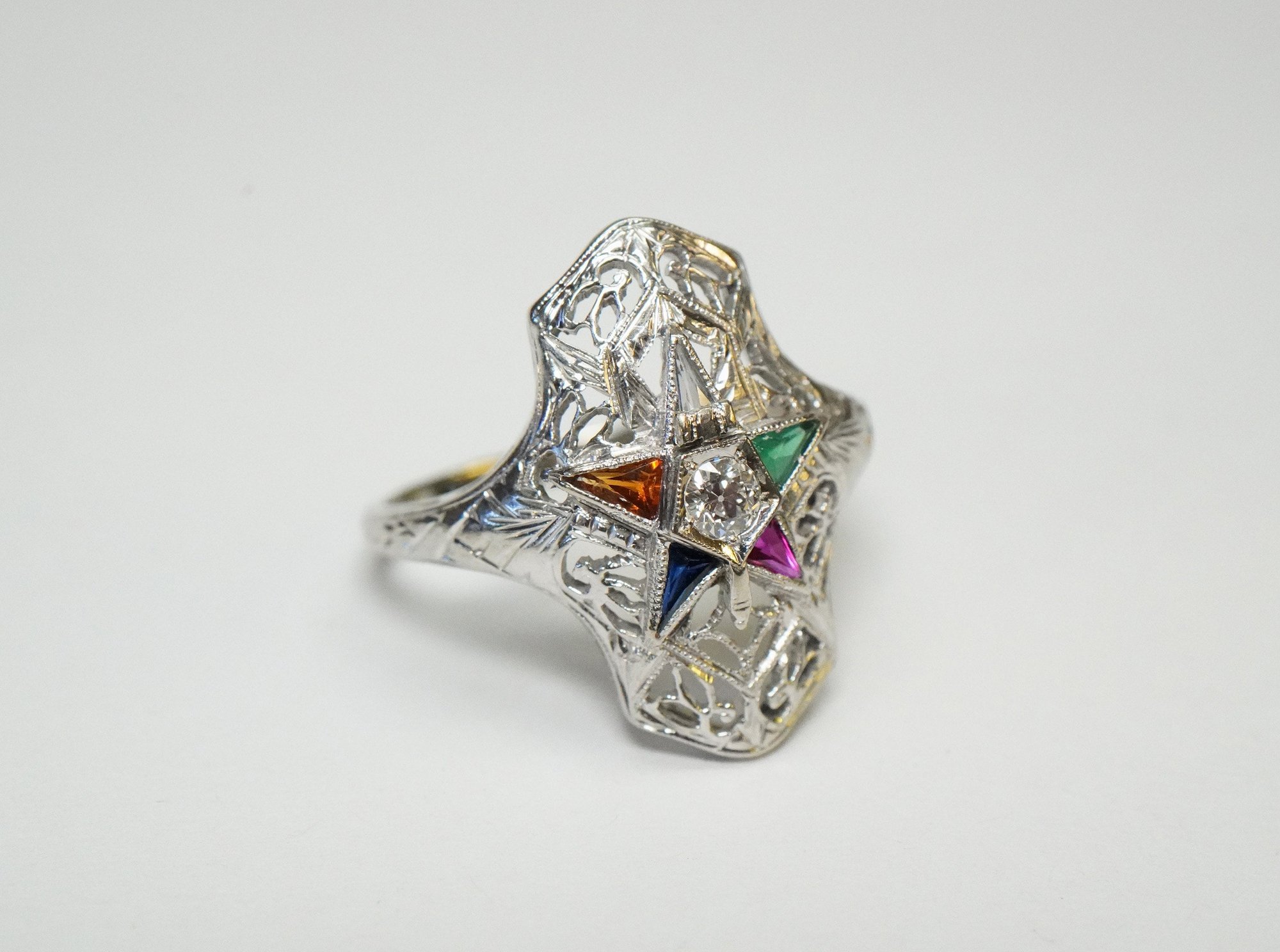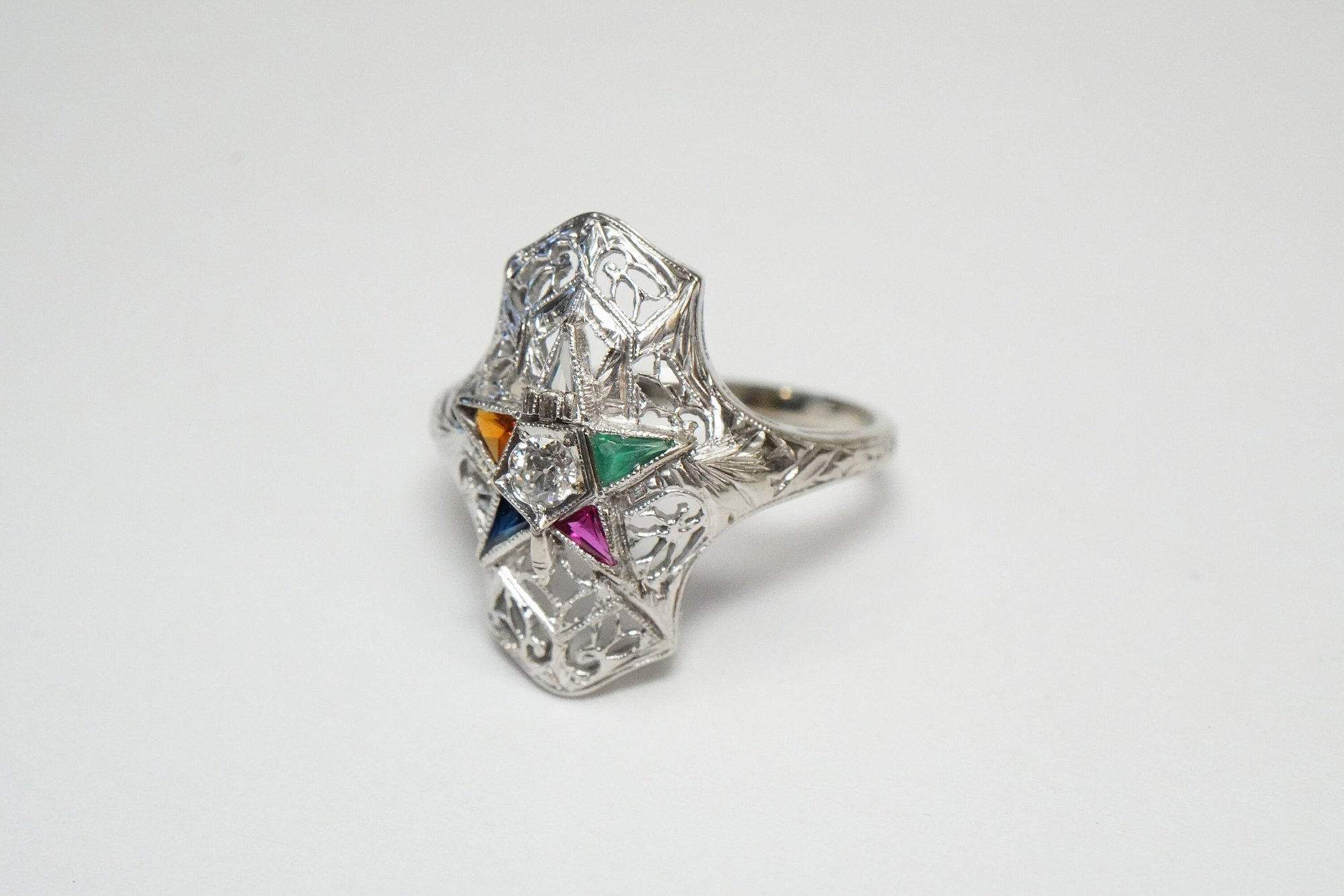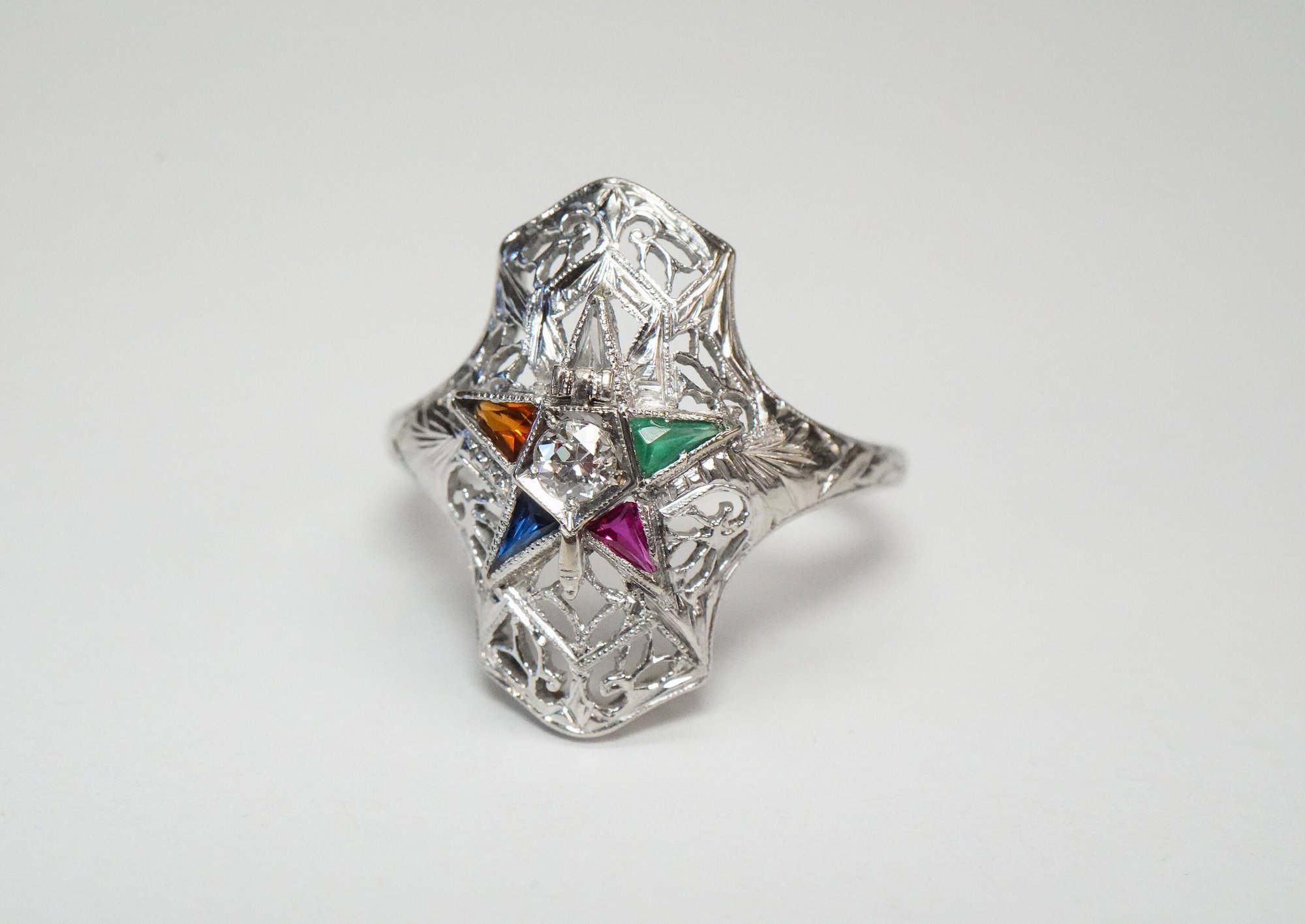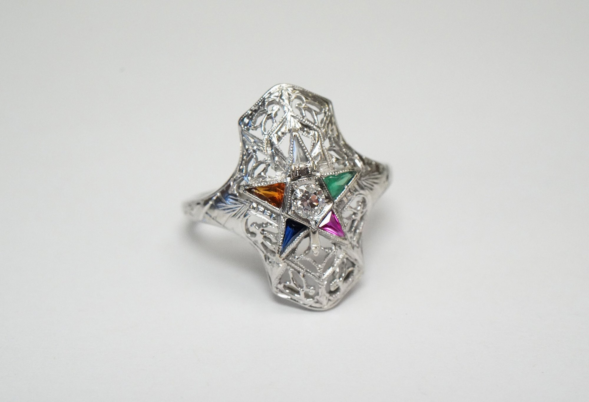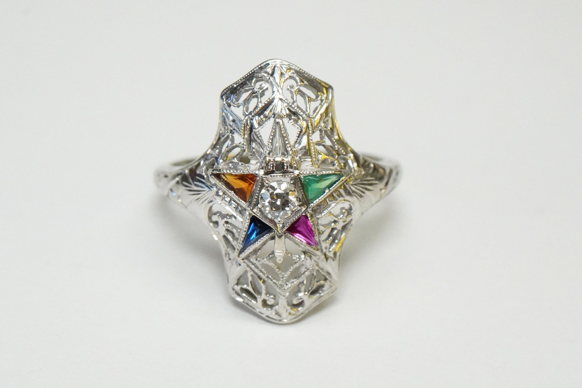 Original product name: Art Deco 18k White Gold, Eastern Star Filigree Ring - ~.08ct Old European Cut Center Diamond - Exquisite Antique Eastern Star Ring