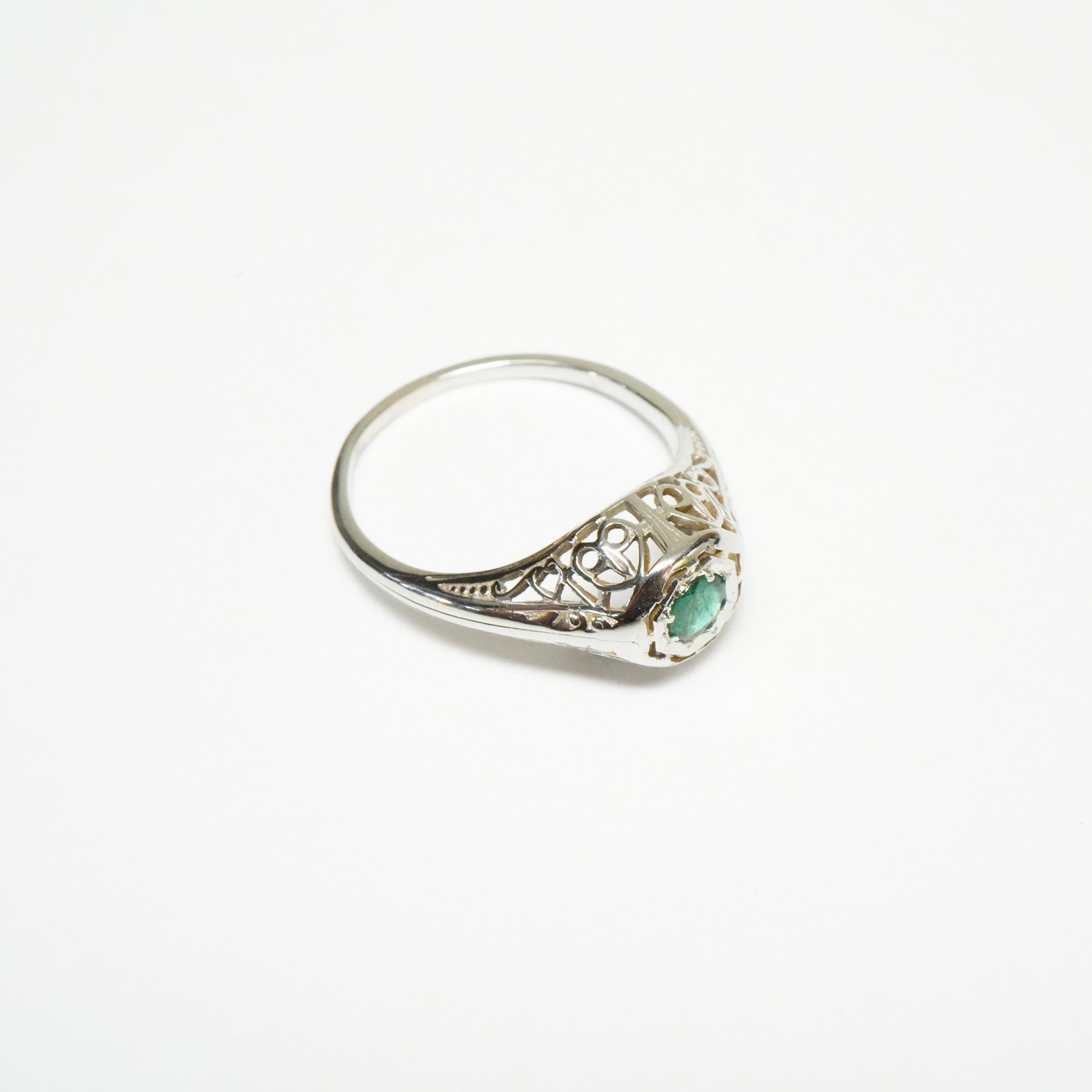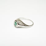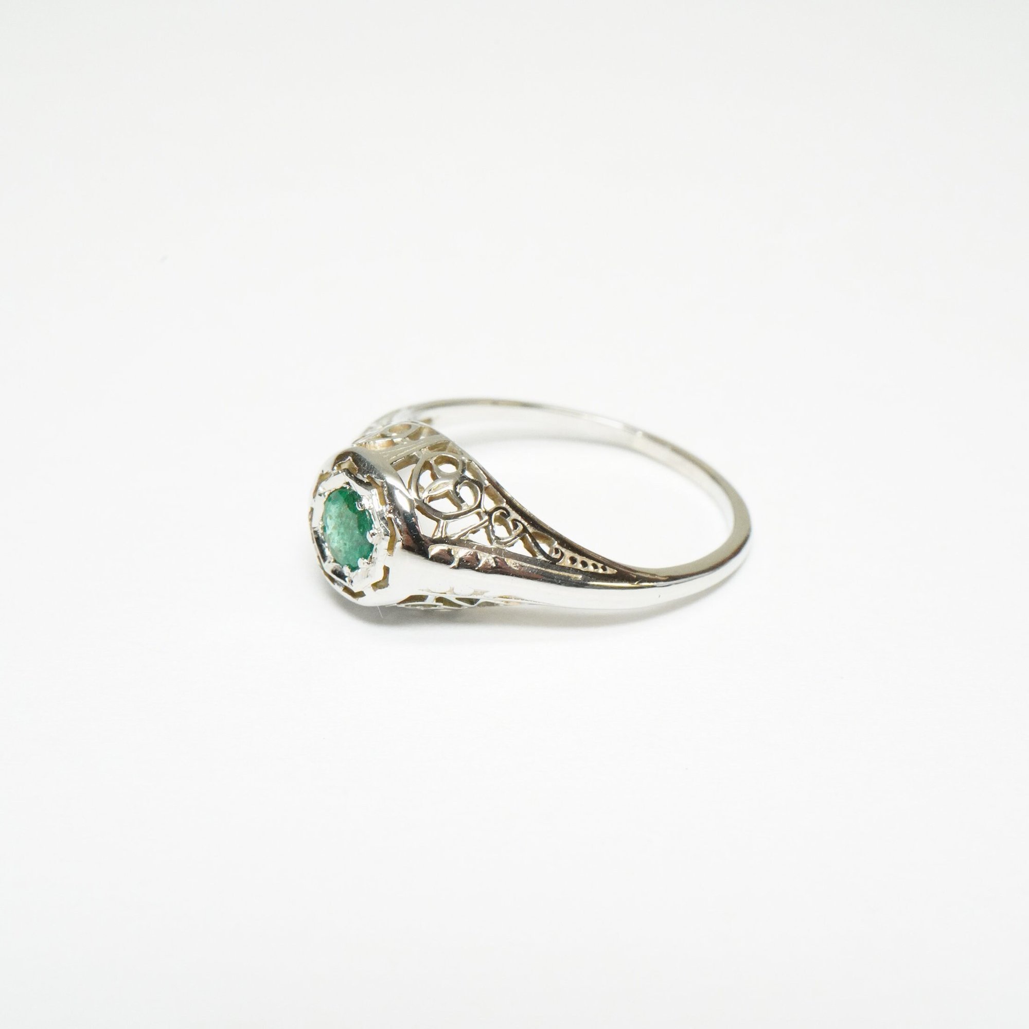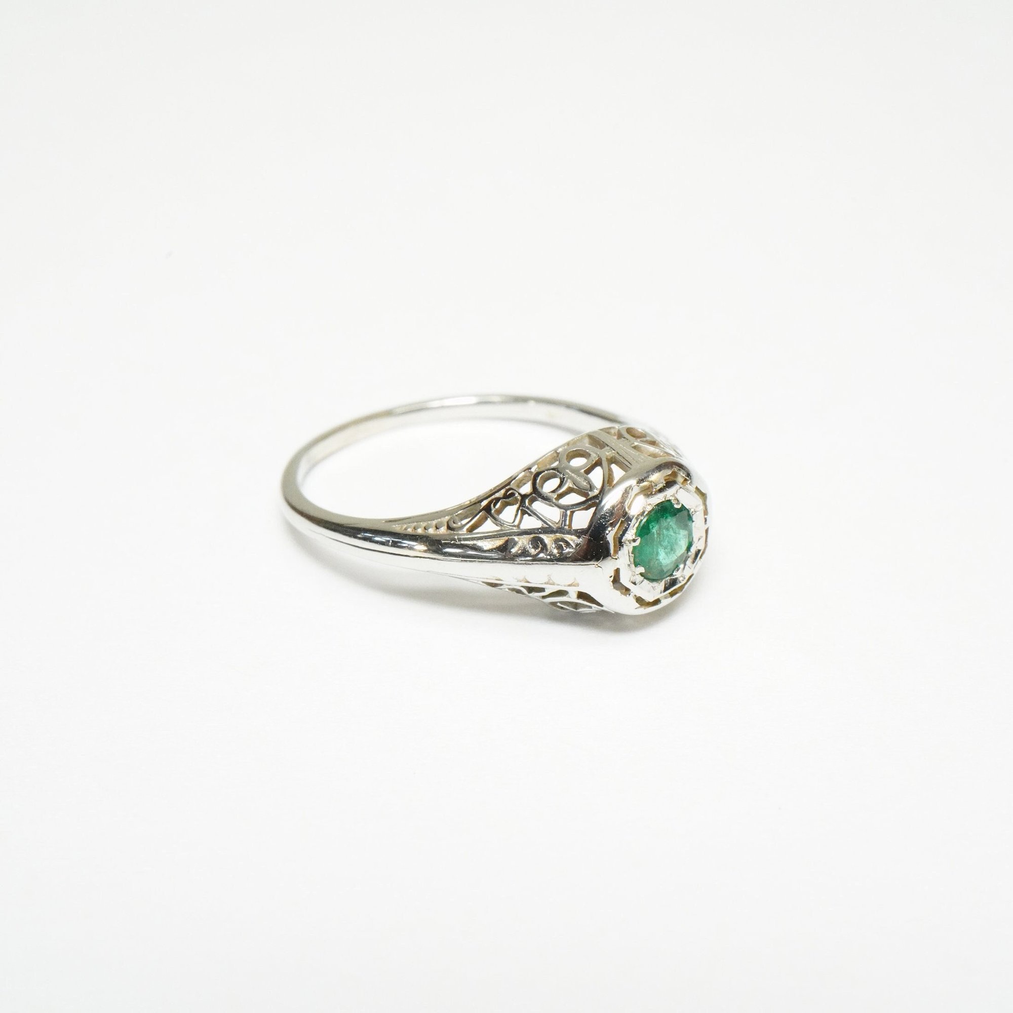 Art Deco 18k White Gold, Emerald Filigree Ring - ~.20 Carat Emerald Center