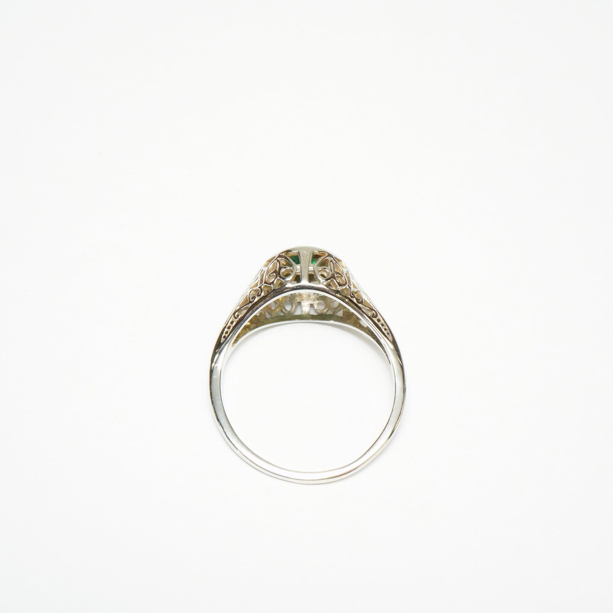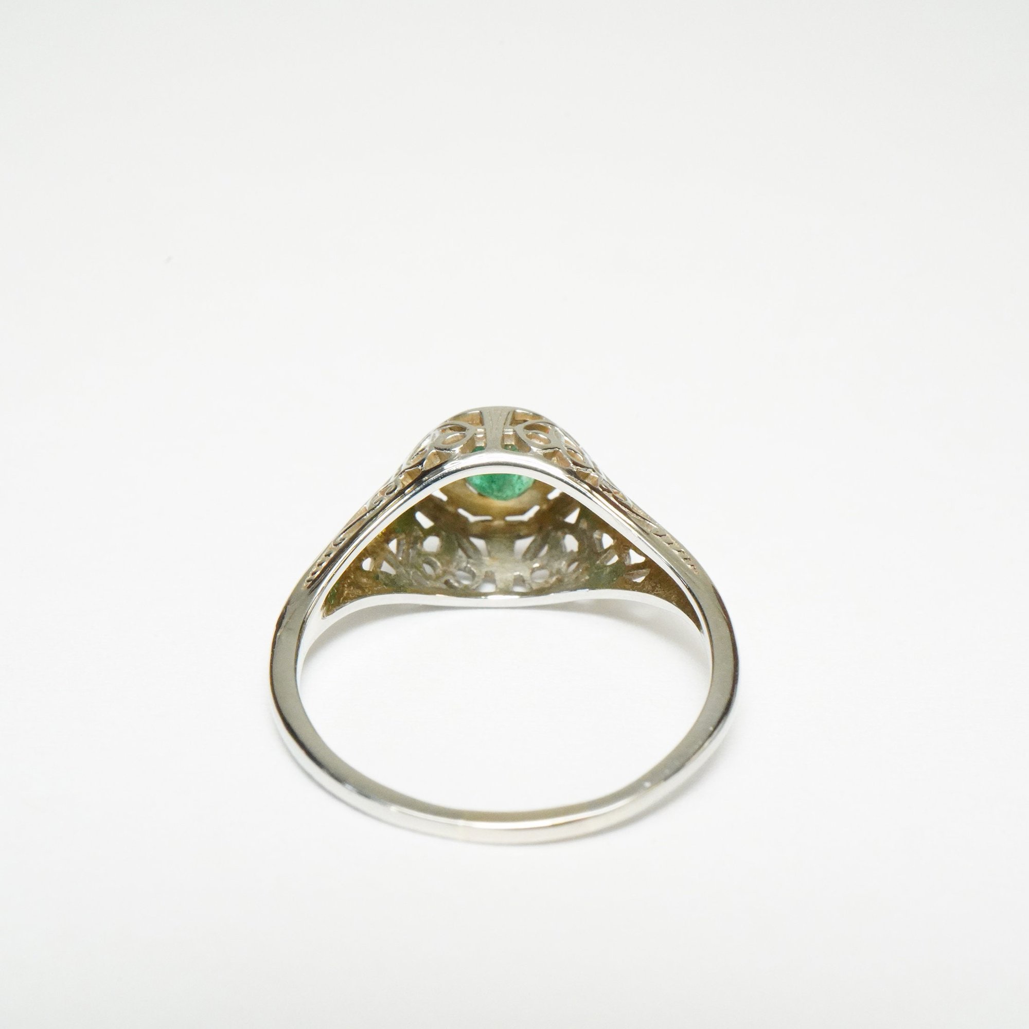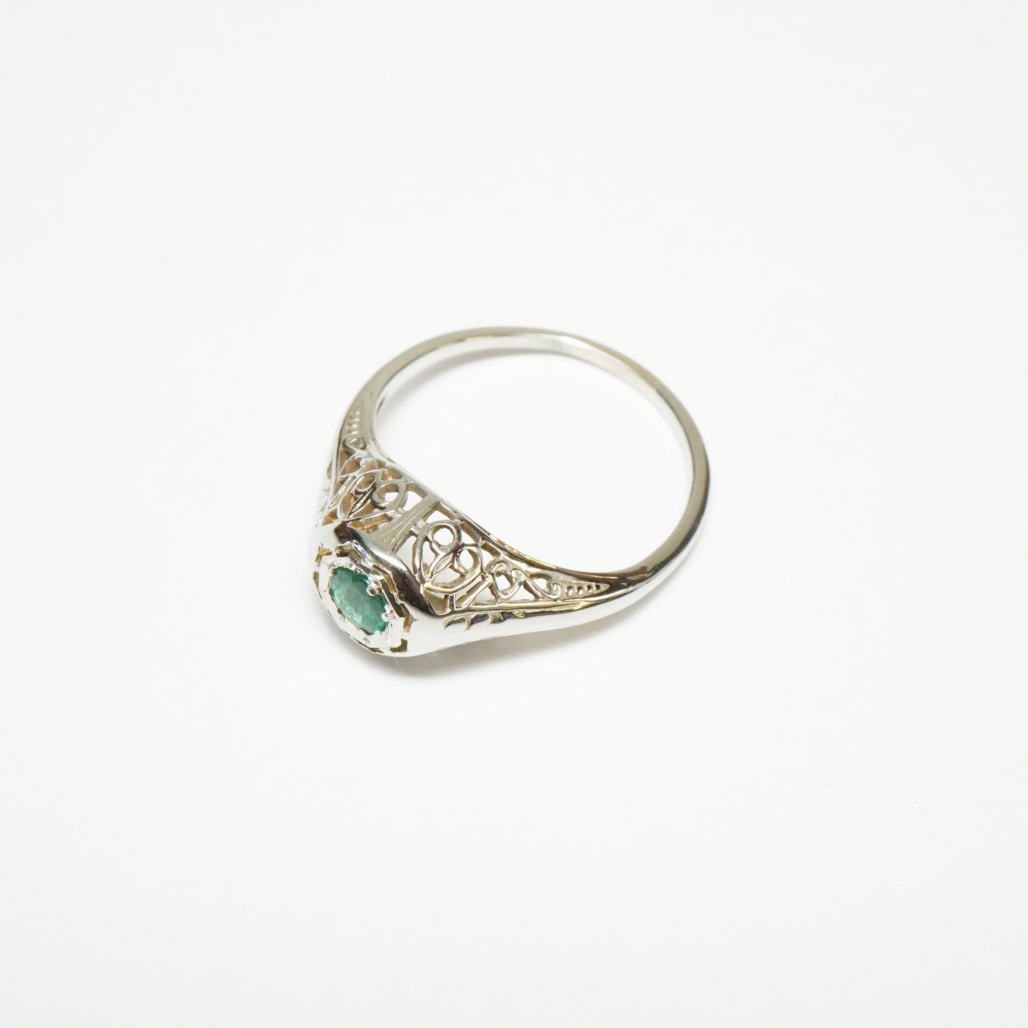 Art Deco 18k White Gold, Emerald Filigree Ring - ~.20 Carat Emerald Center