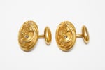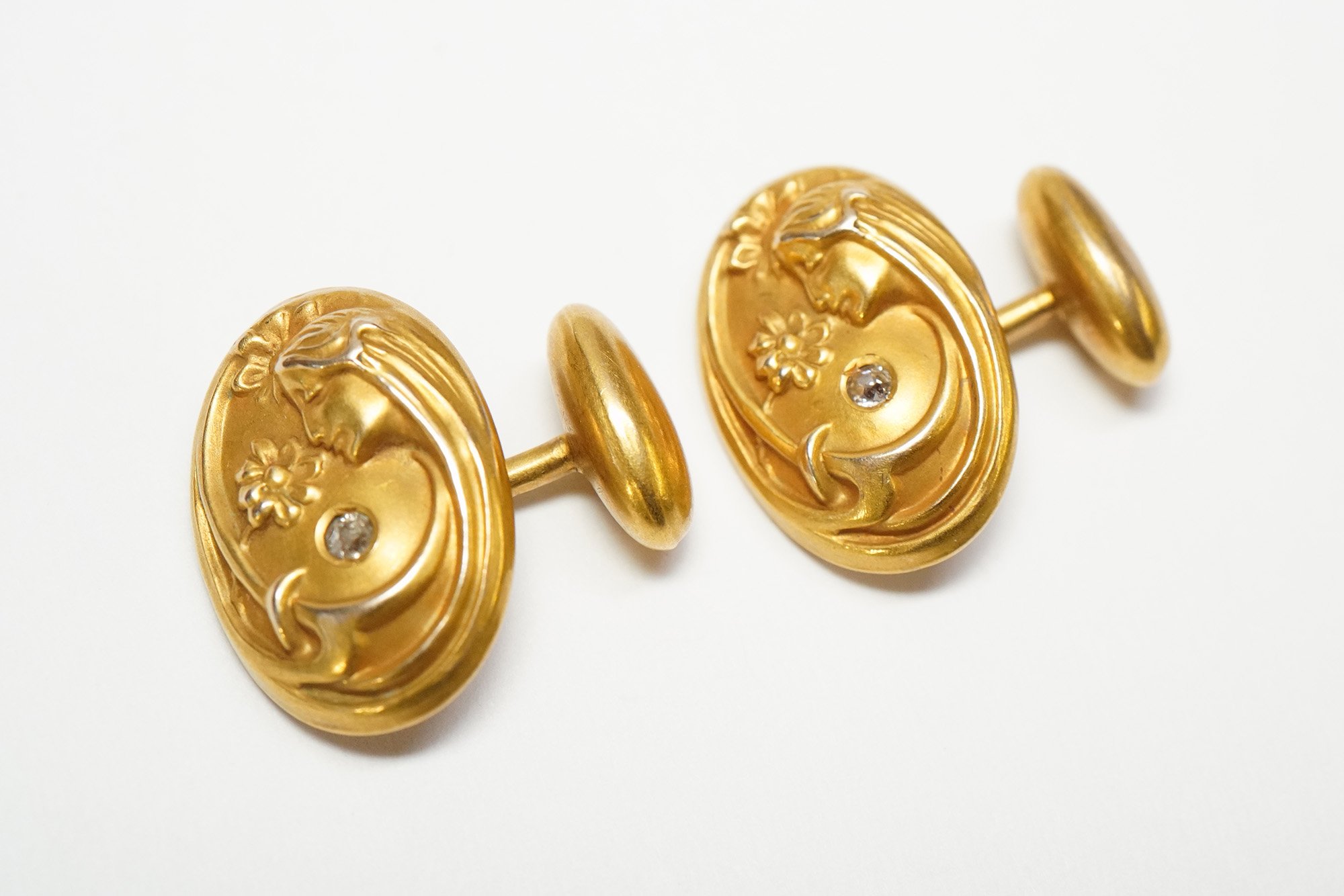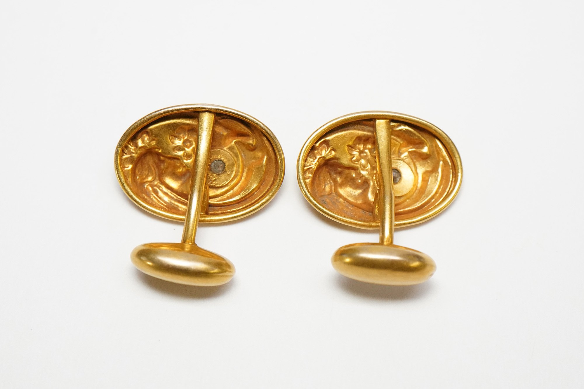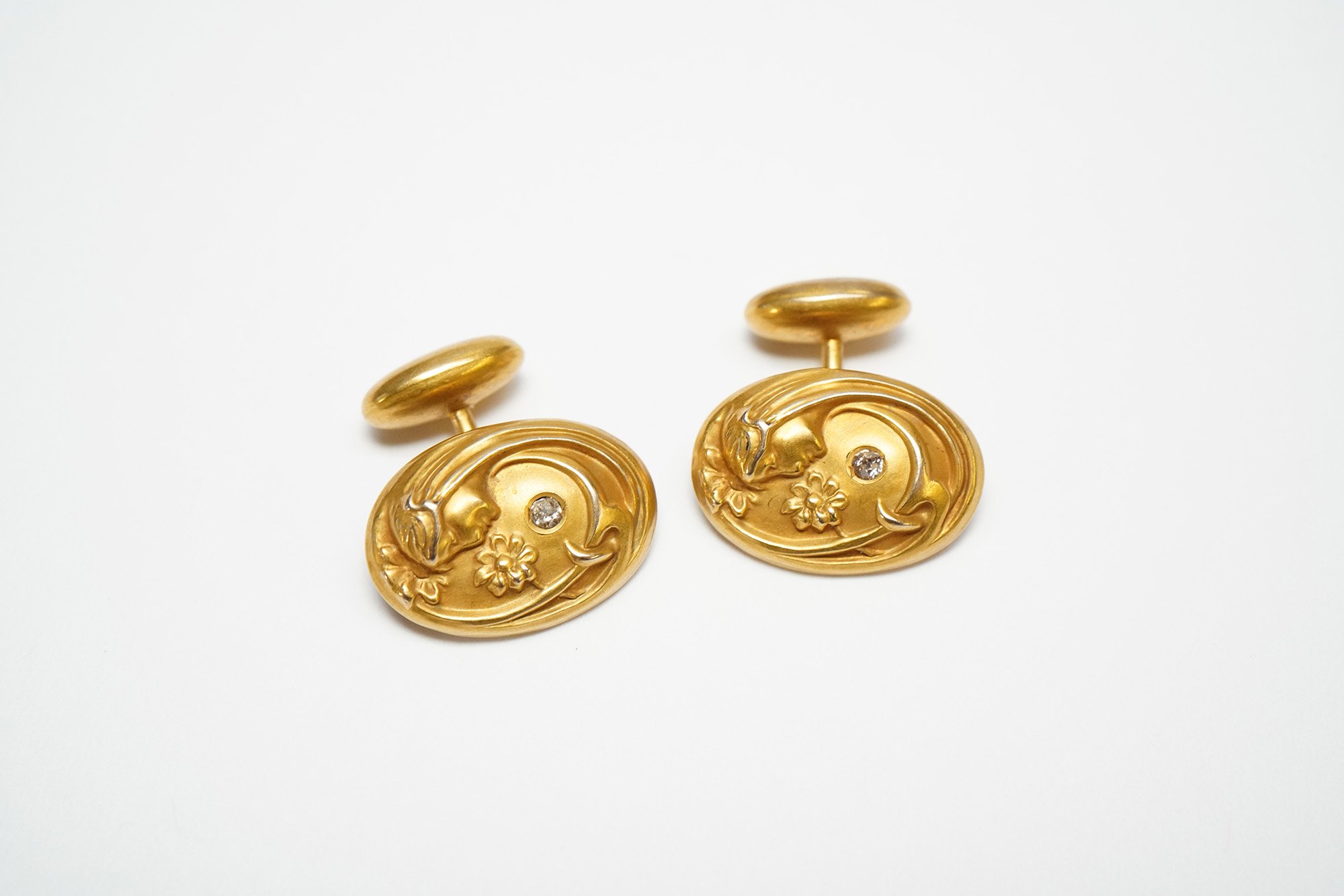 Art Nouveau 10k Yellow Gold Cufflinks - Figural with Floral Motifs and Diamond Accents