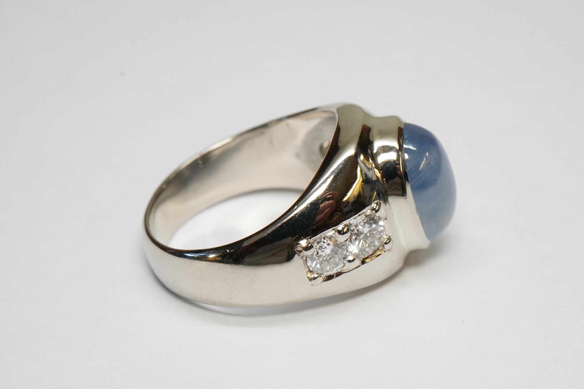 Features beautiful, highly transparent natural lavender blue star sapphire. ~11.0 by 8.4mm, weighing ~8.00ct.