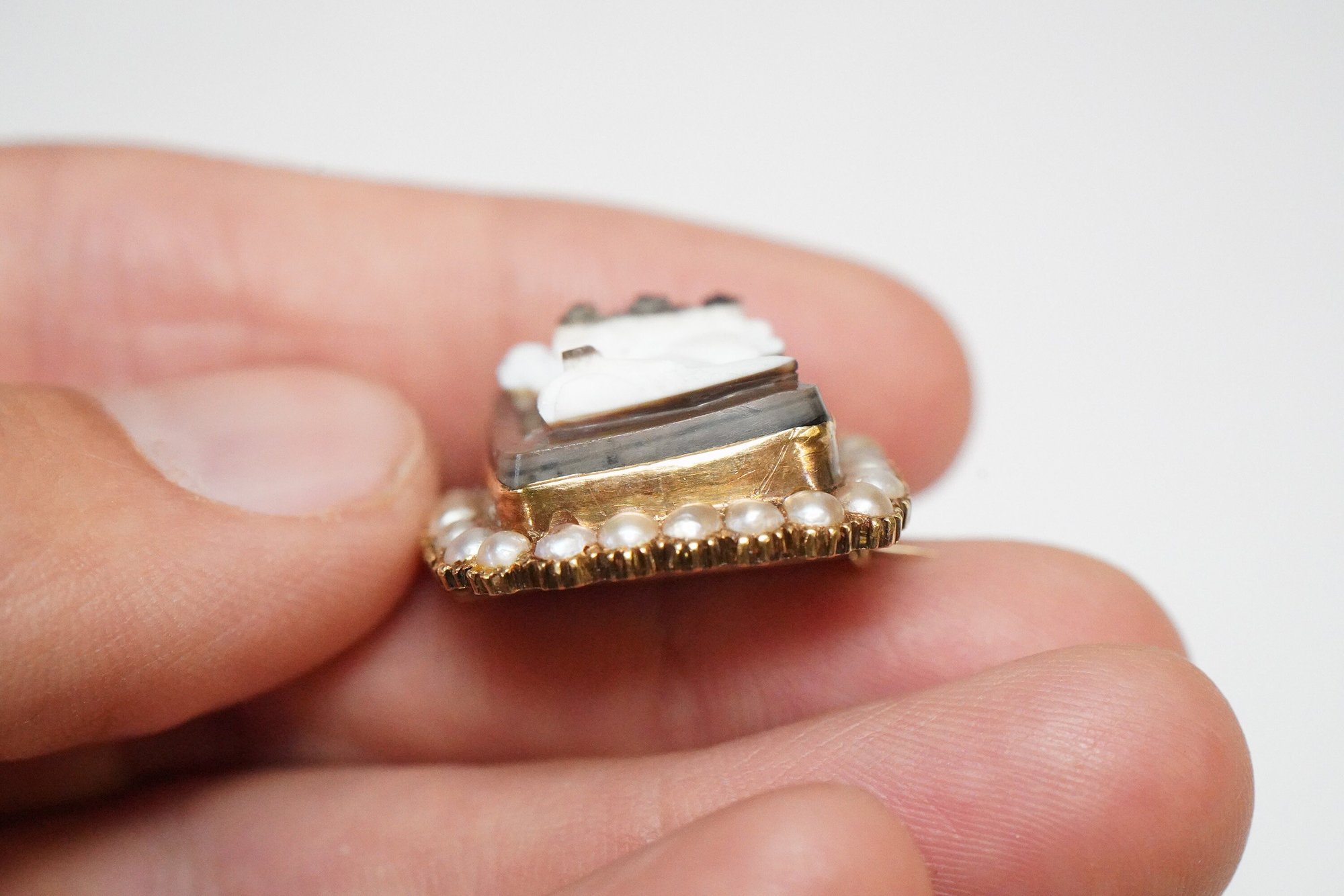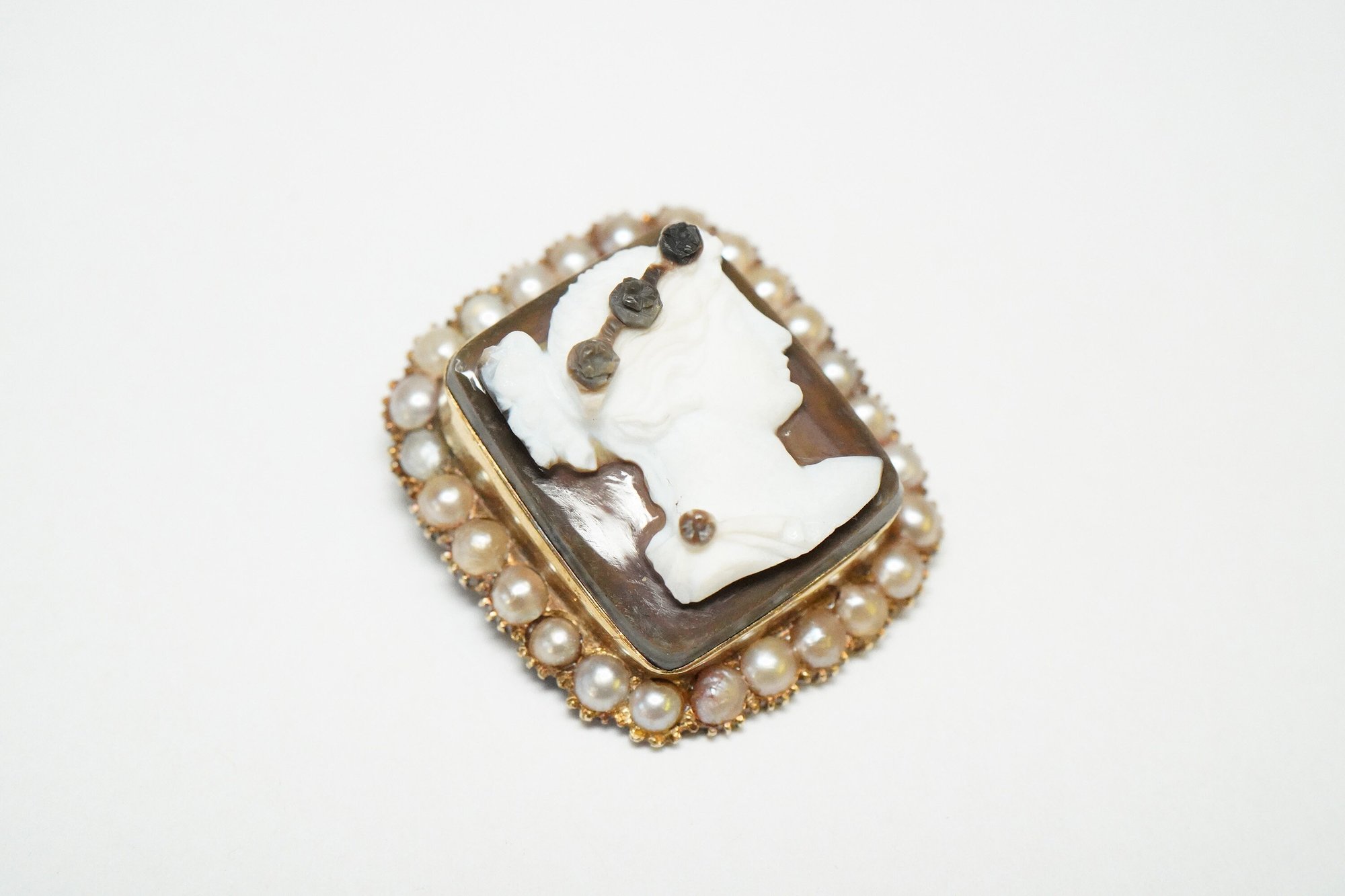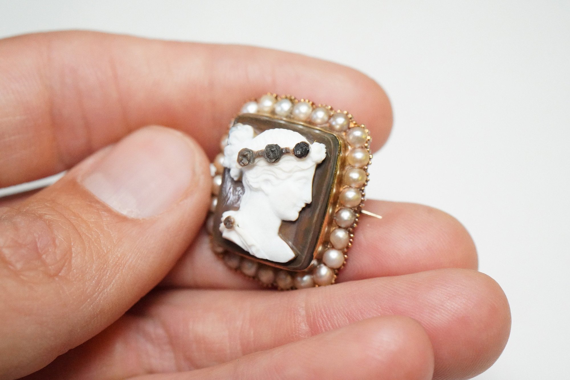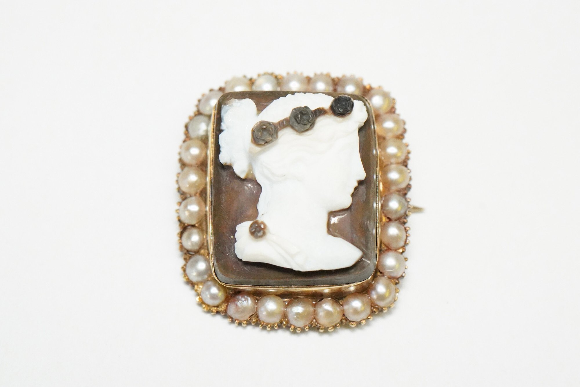 Original product name: Early Victorian 14k Yellow Gold, High Relief Carved Stone Cameo - Lovely Lady in Profile Cameo Brooch or Pin - Half-Pearl Border