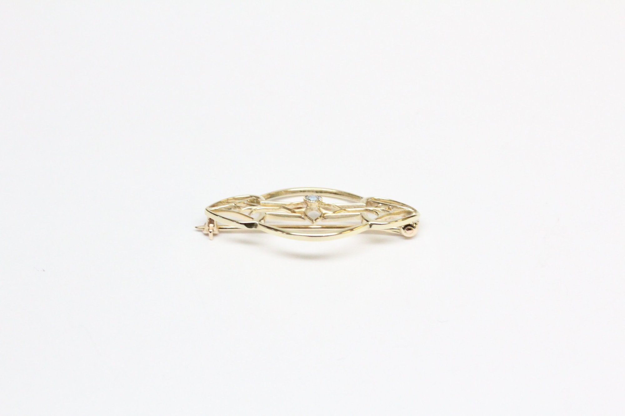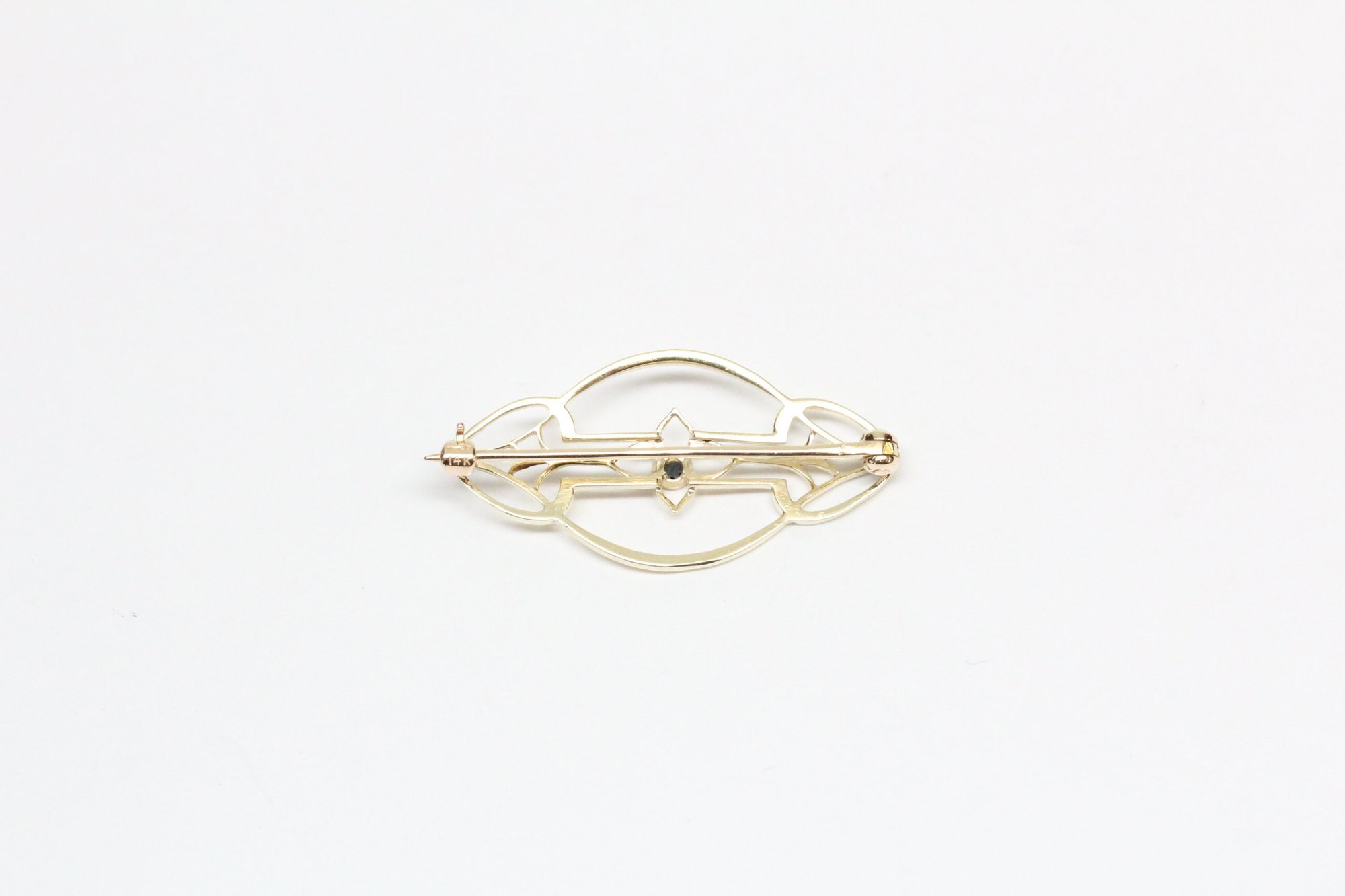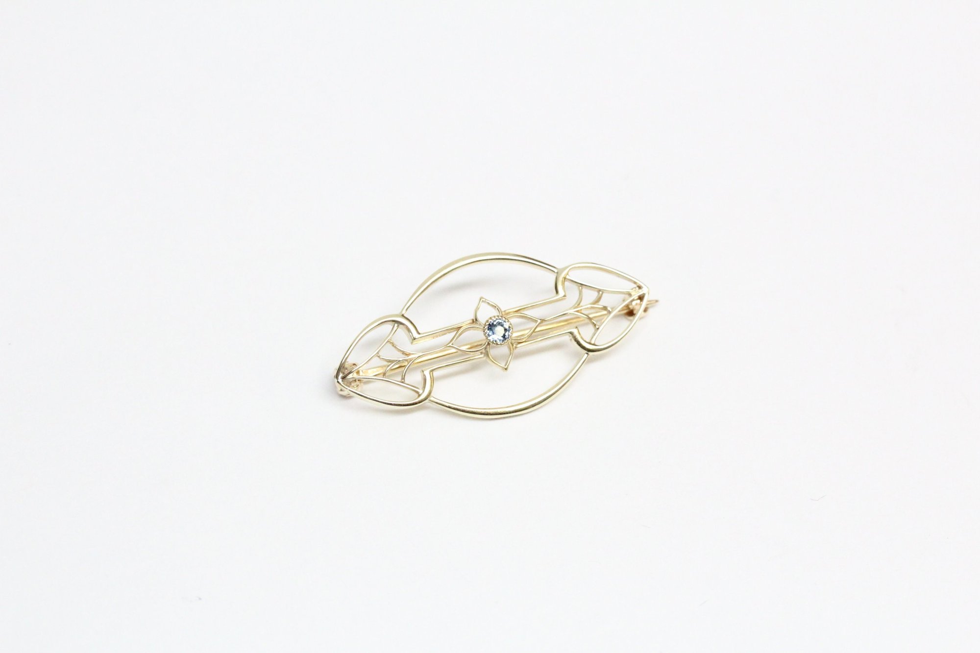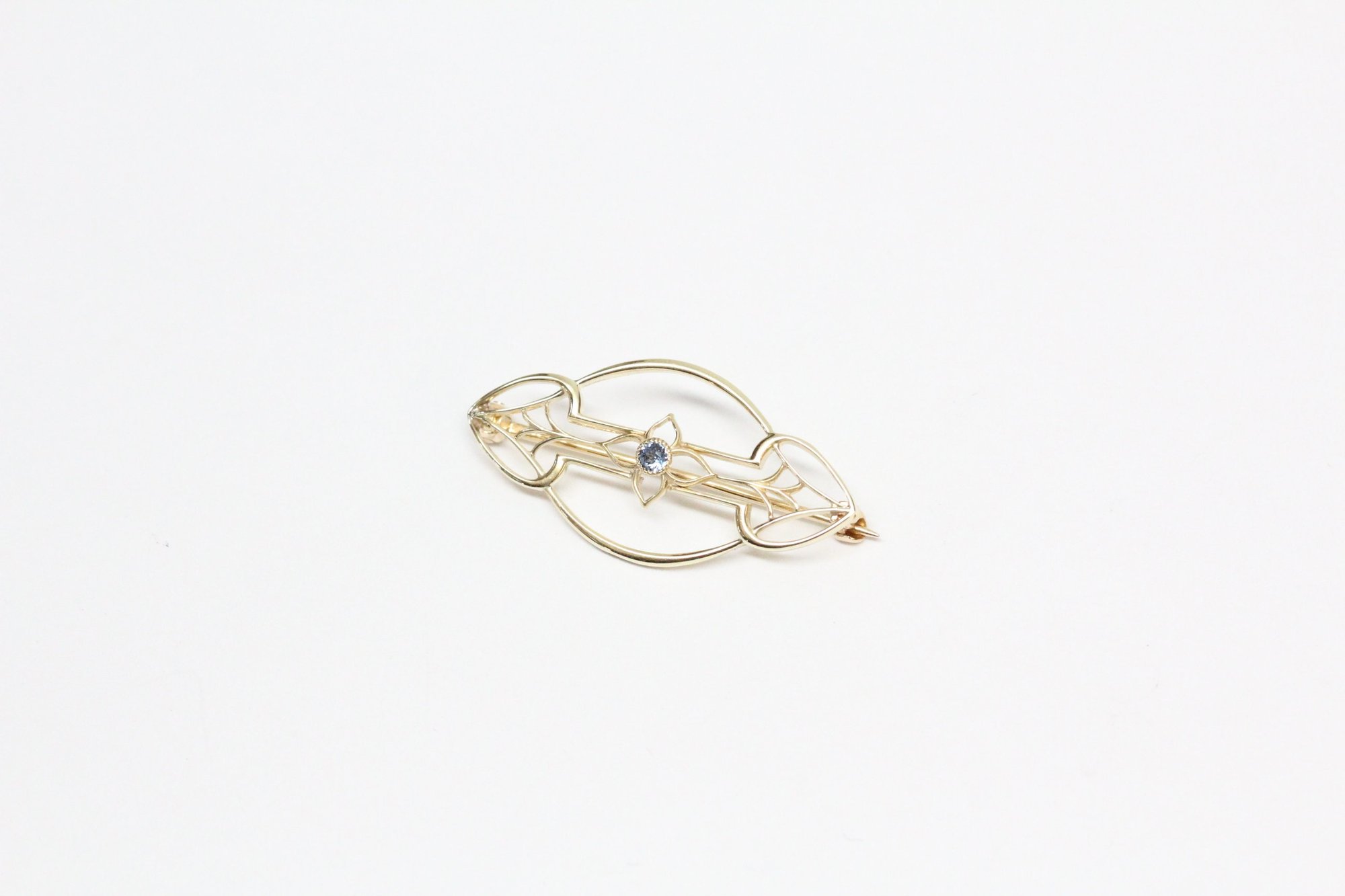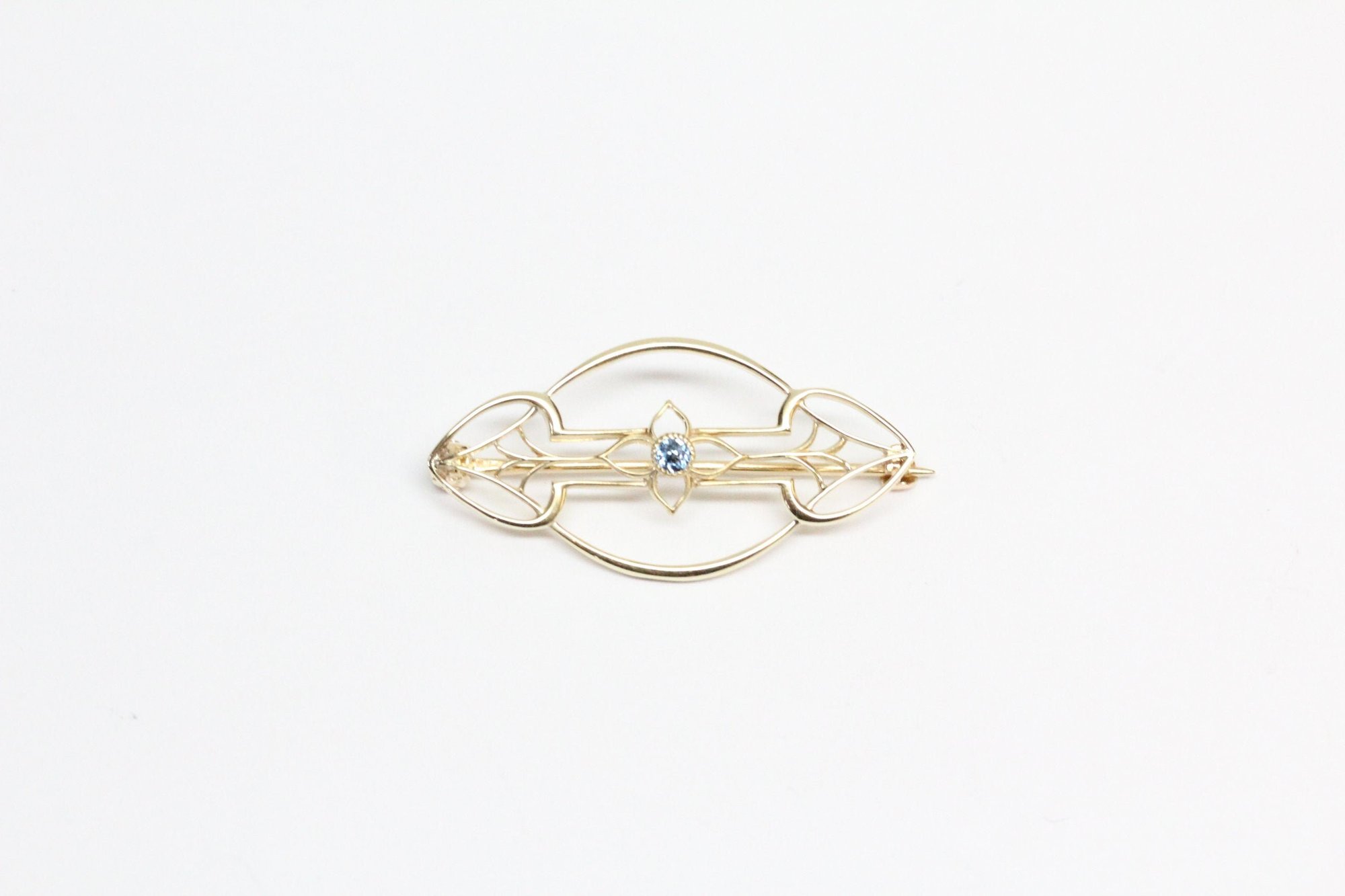Original product name: Edwardian 14k Yellow Gold, Sapphire Filigree Brooch - Lovely Filigree Hat, Lapel, or Bar Pin - Excellent Condition