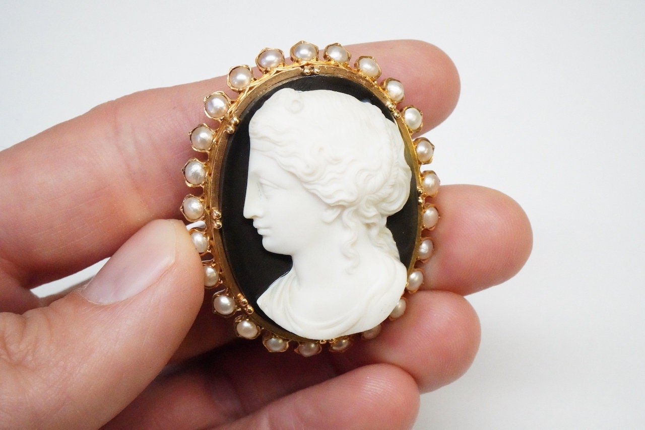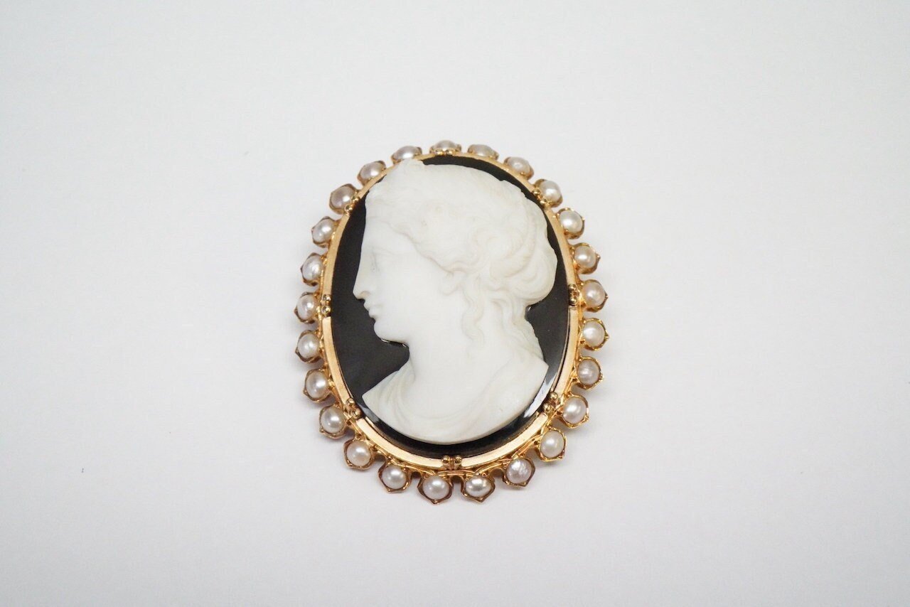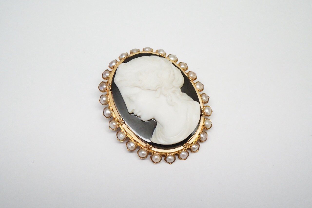 Stone - Hand-carved hardstone agate cameo. An exquisite carving, surrounded by half pearls.