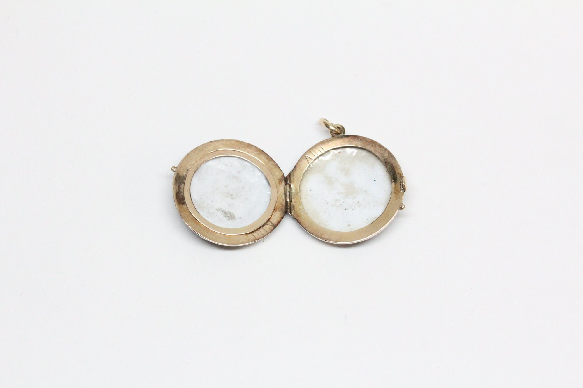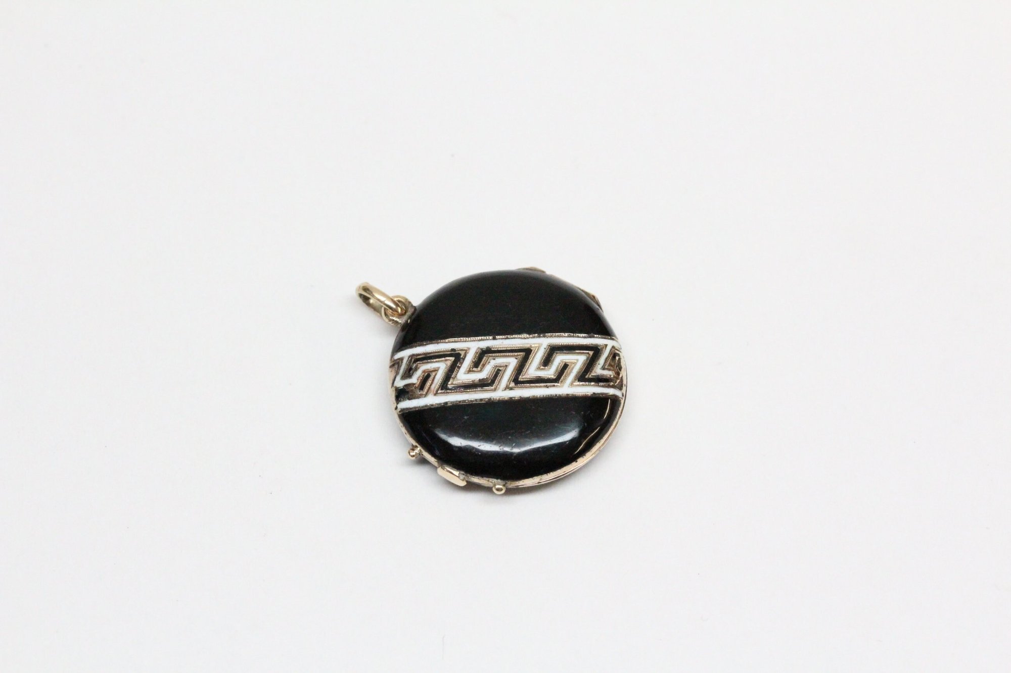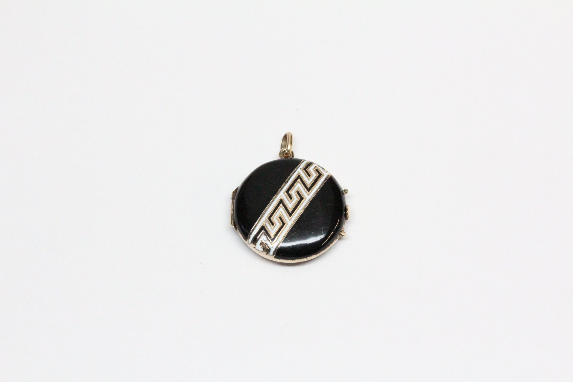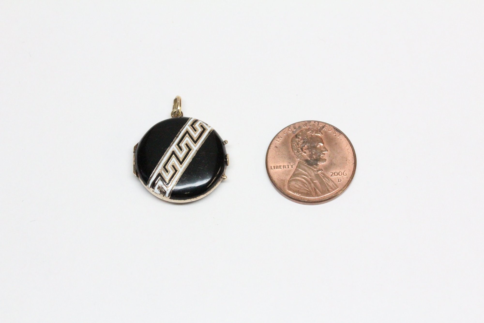 Notes - This lovely antique locket features beautiful Greek Key motifs in glass enamel. The enamel has some wear, as the price reflects, but it remains a striking pendant.