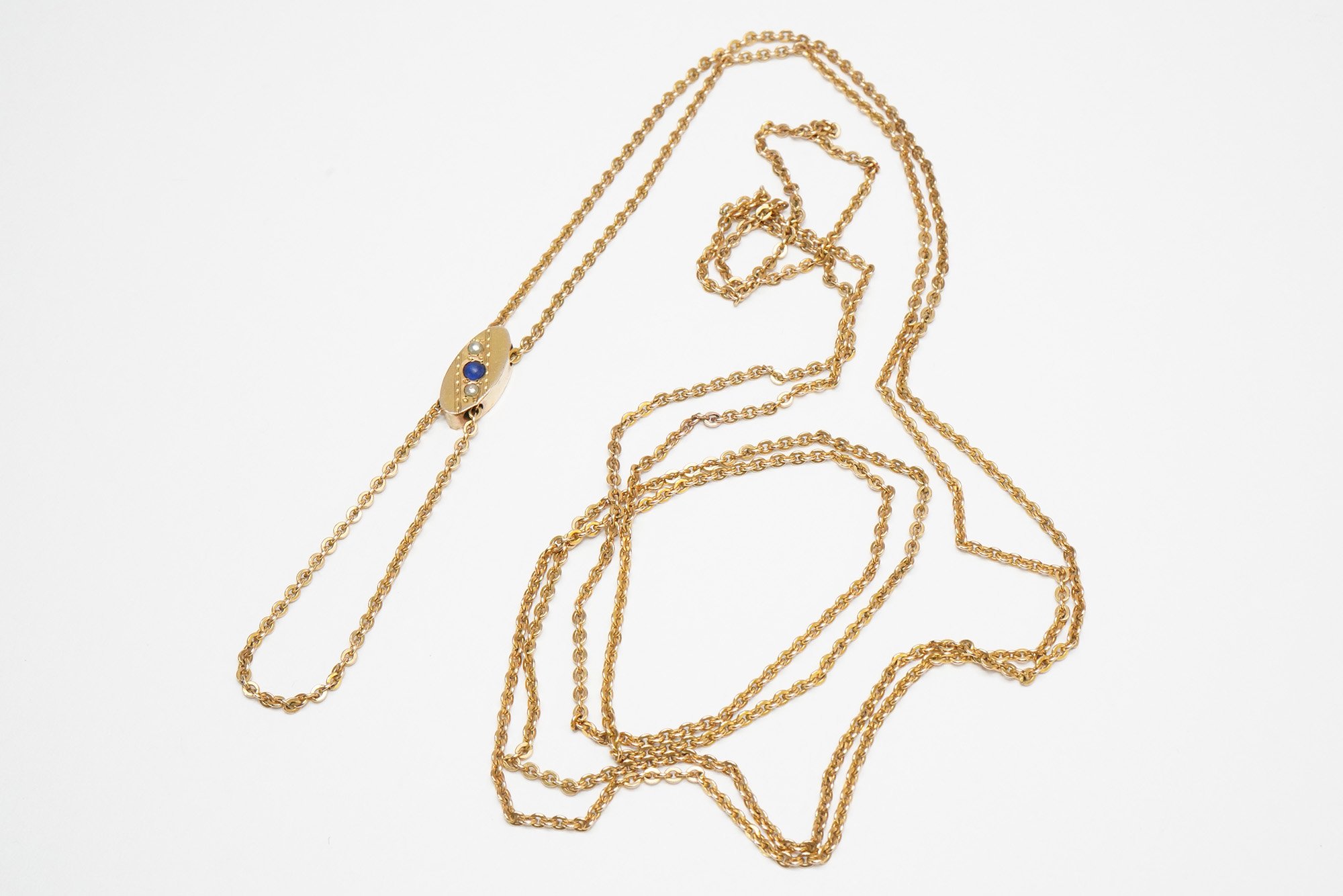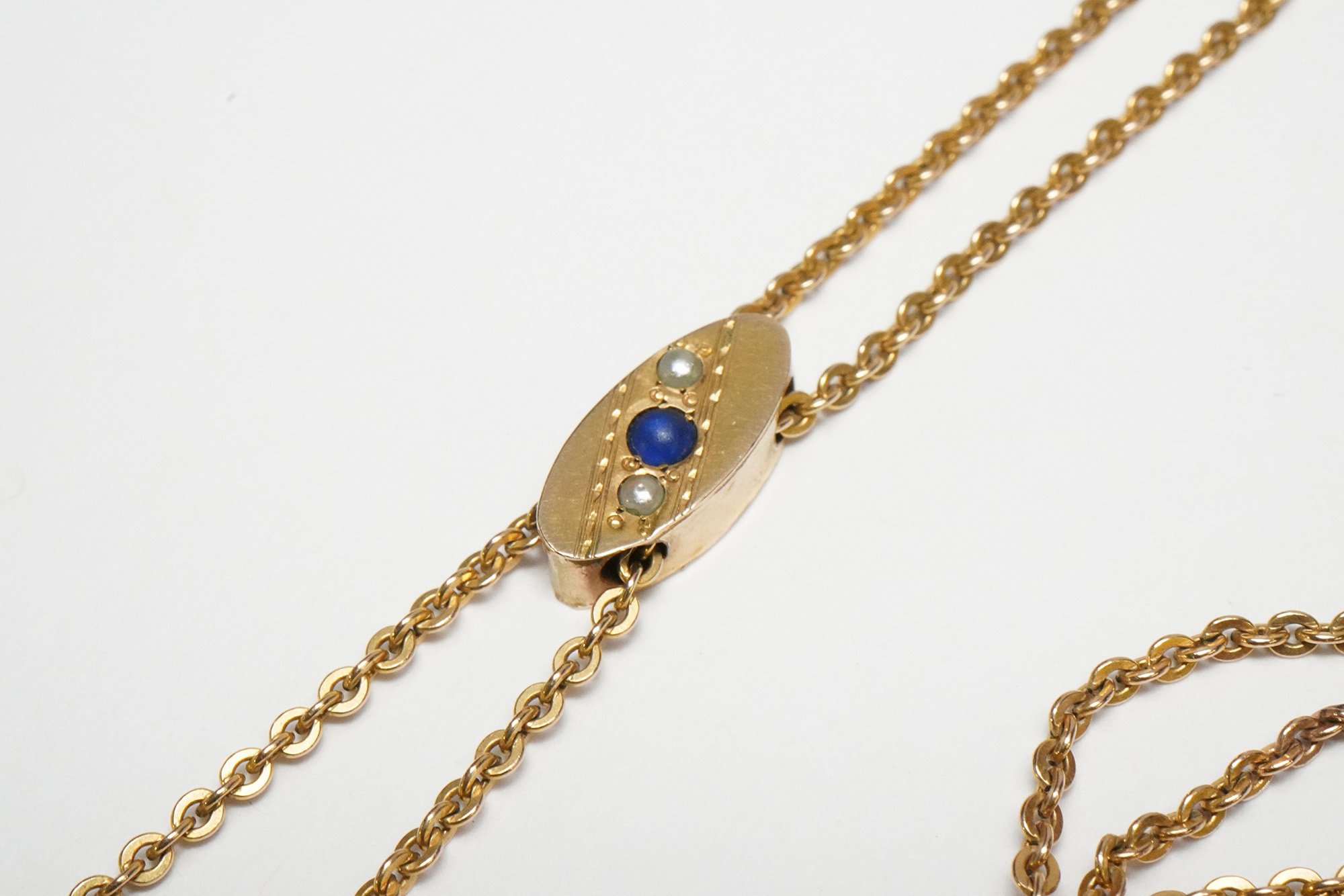 - Slide piece is set with synthetic blue stone and seed pearls.