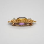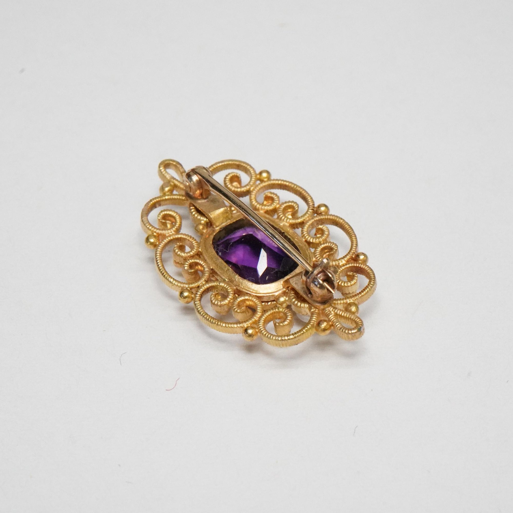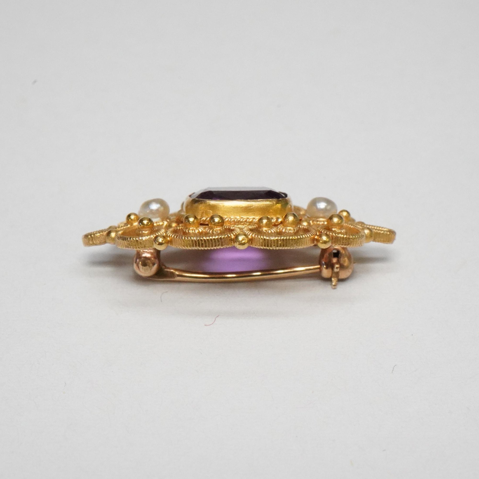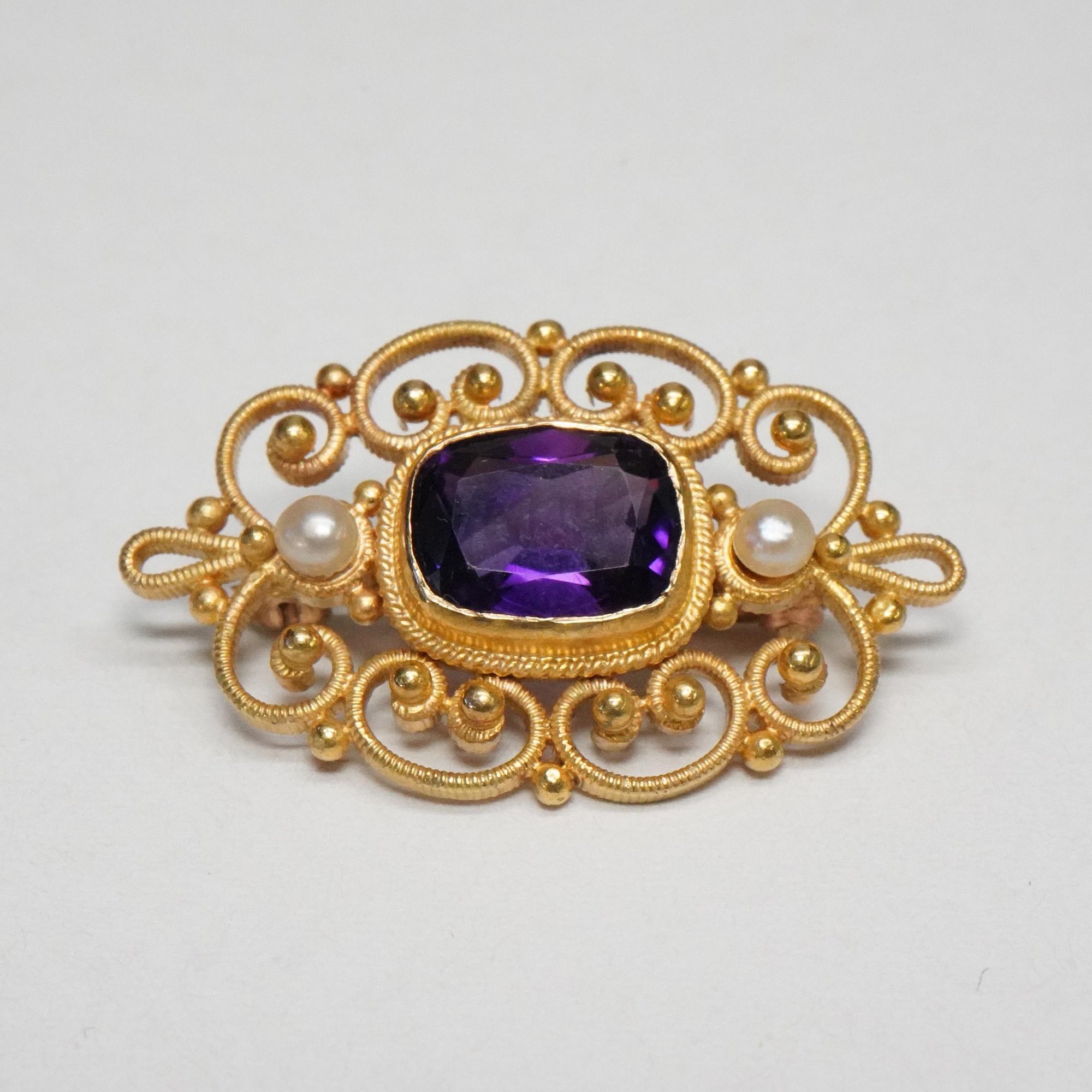 Original product name: Vintage 14k Yellow Gold, Amethyst, Seed Pearl Filigree Brooch - Lovely Filigree Hat, Lapel, or Bar Pin - Excellent Condition