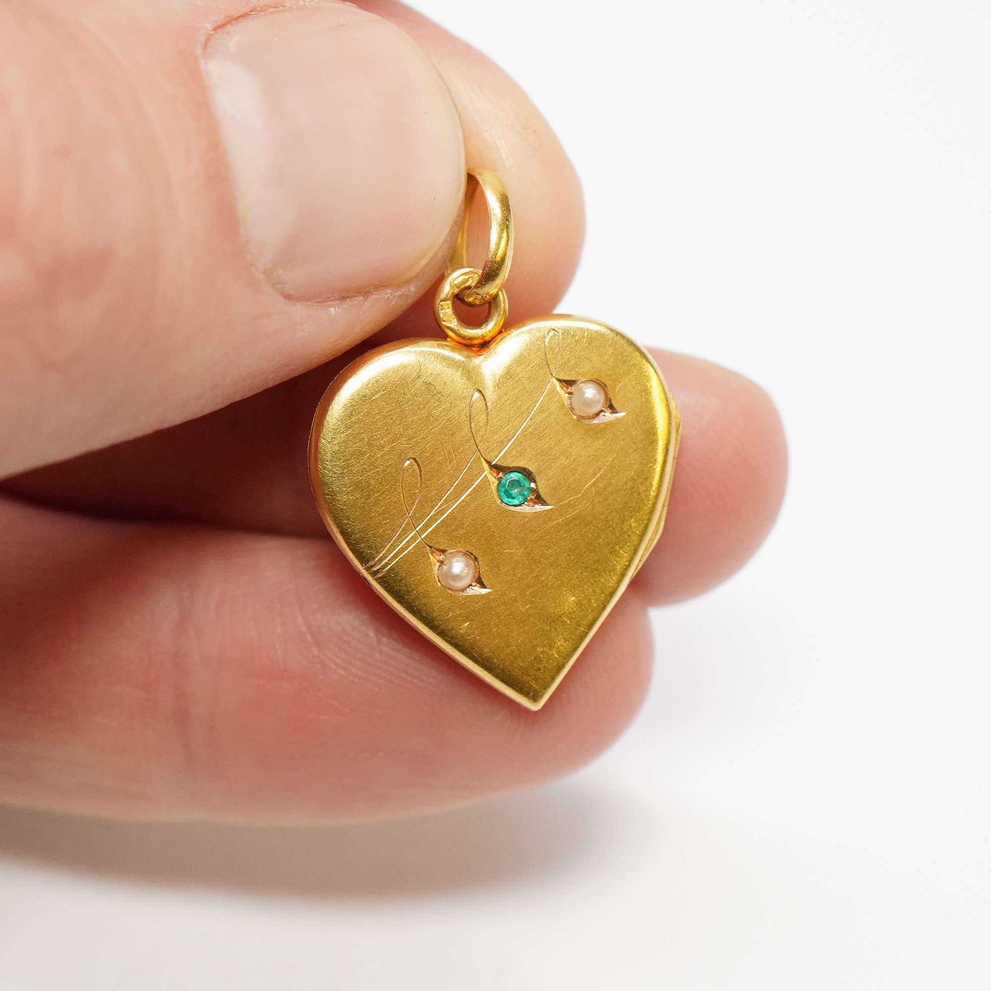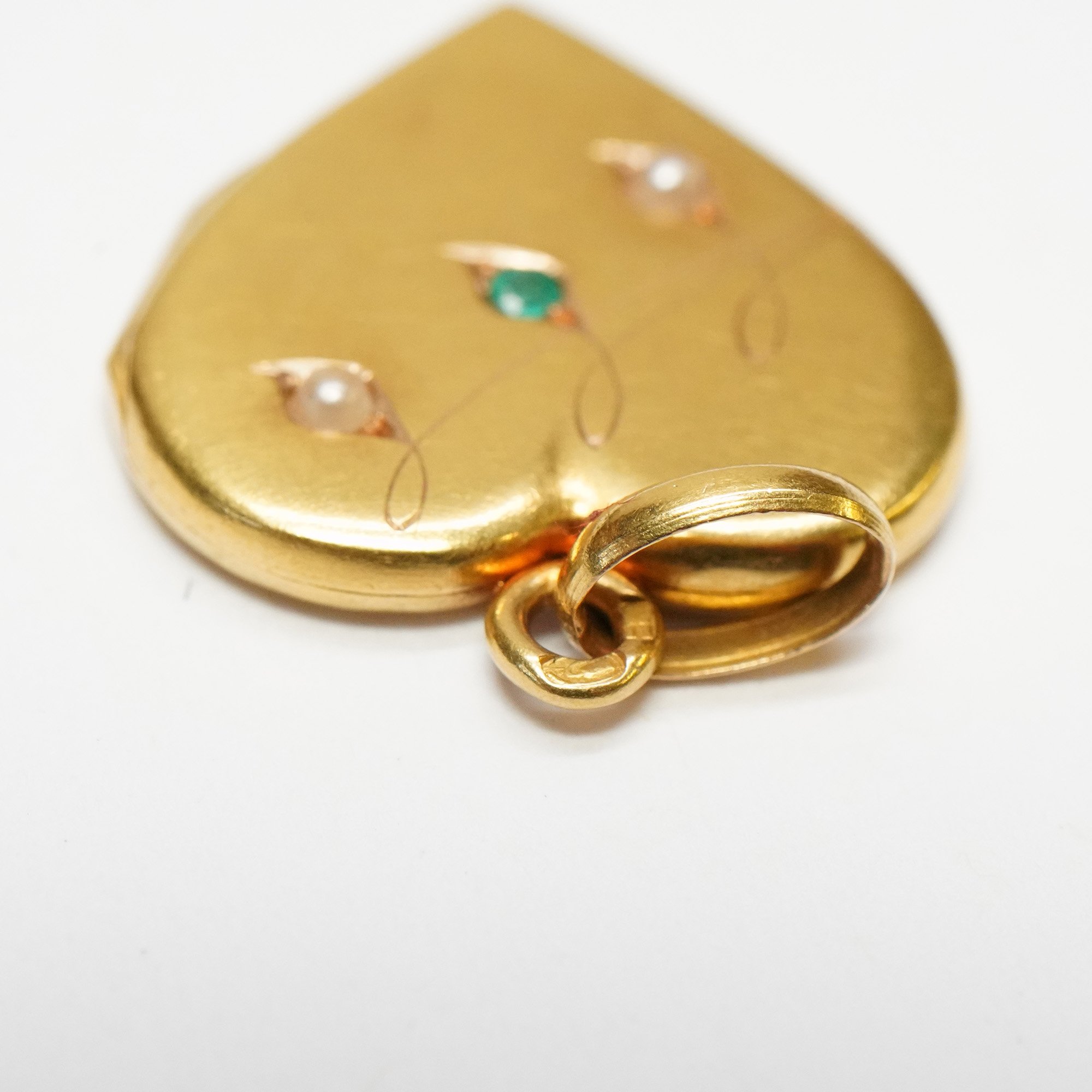- Accented by an emerald and seed pearls.