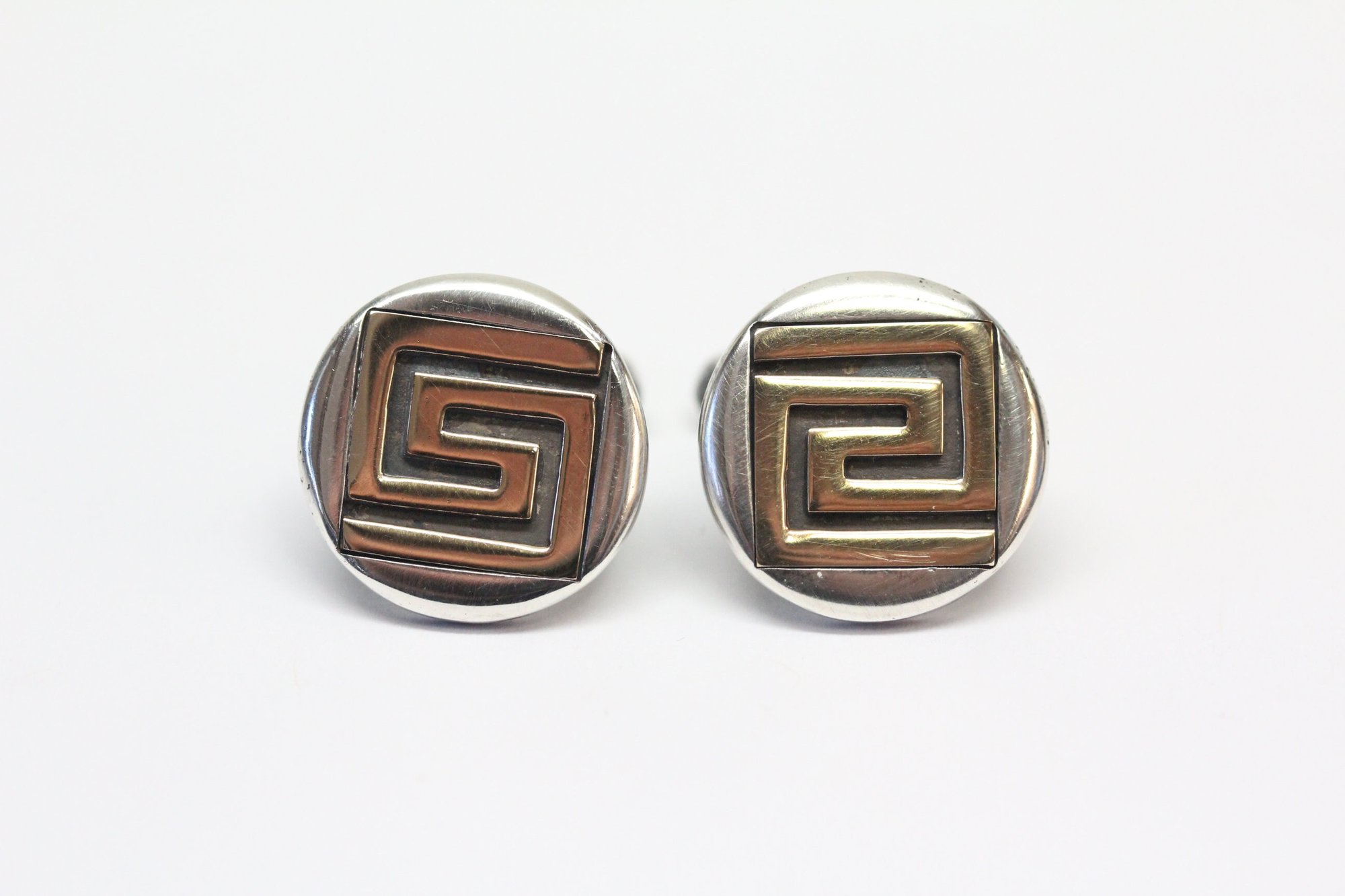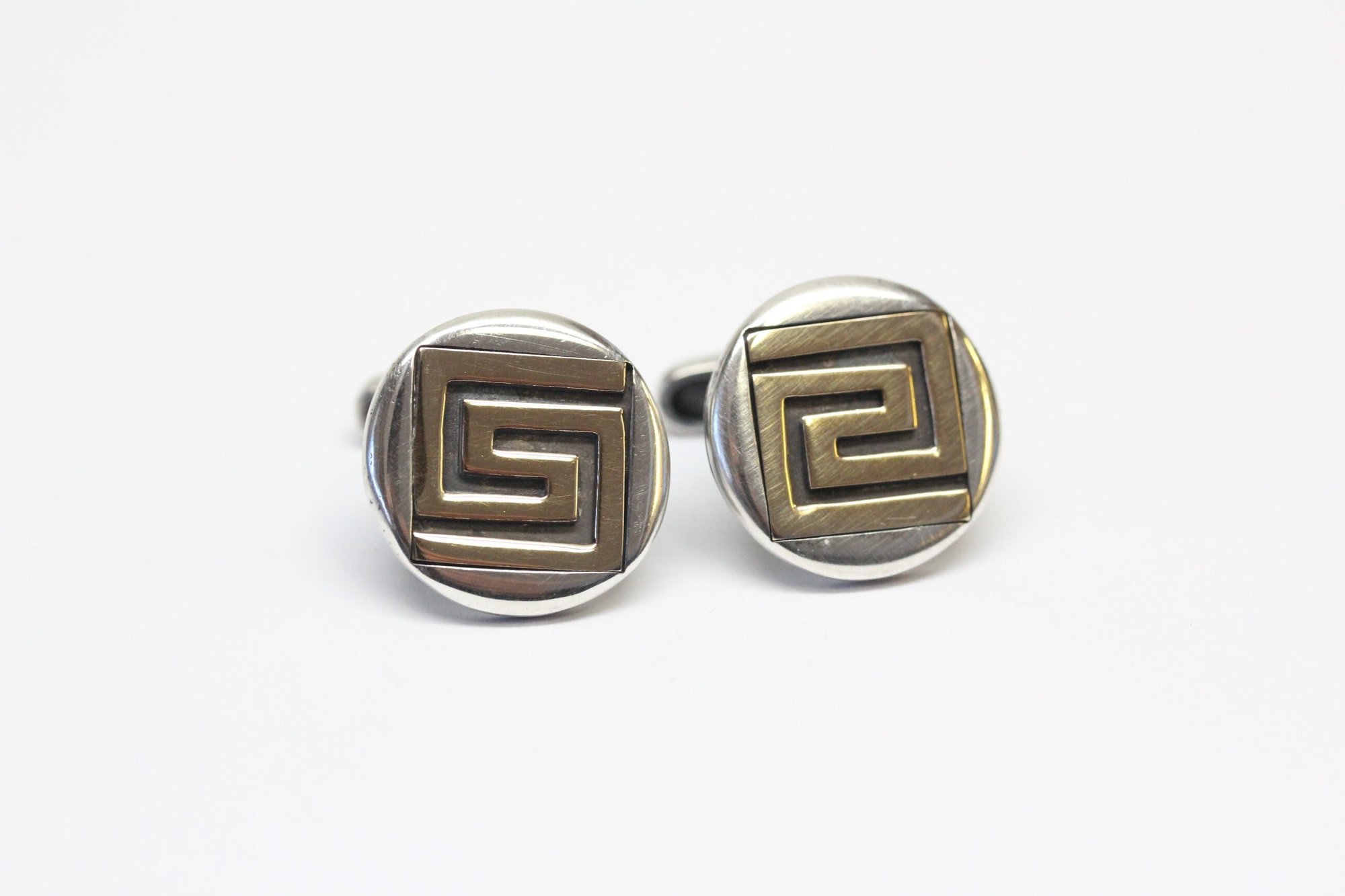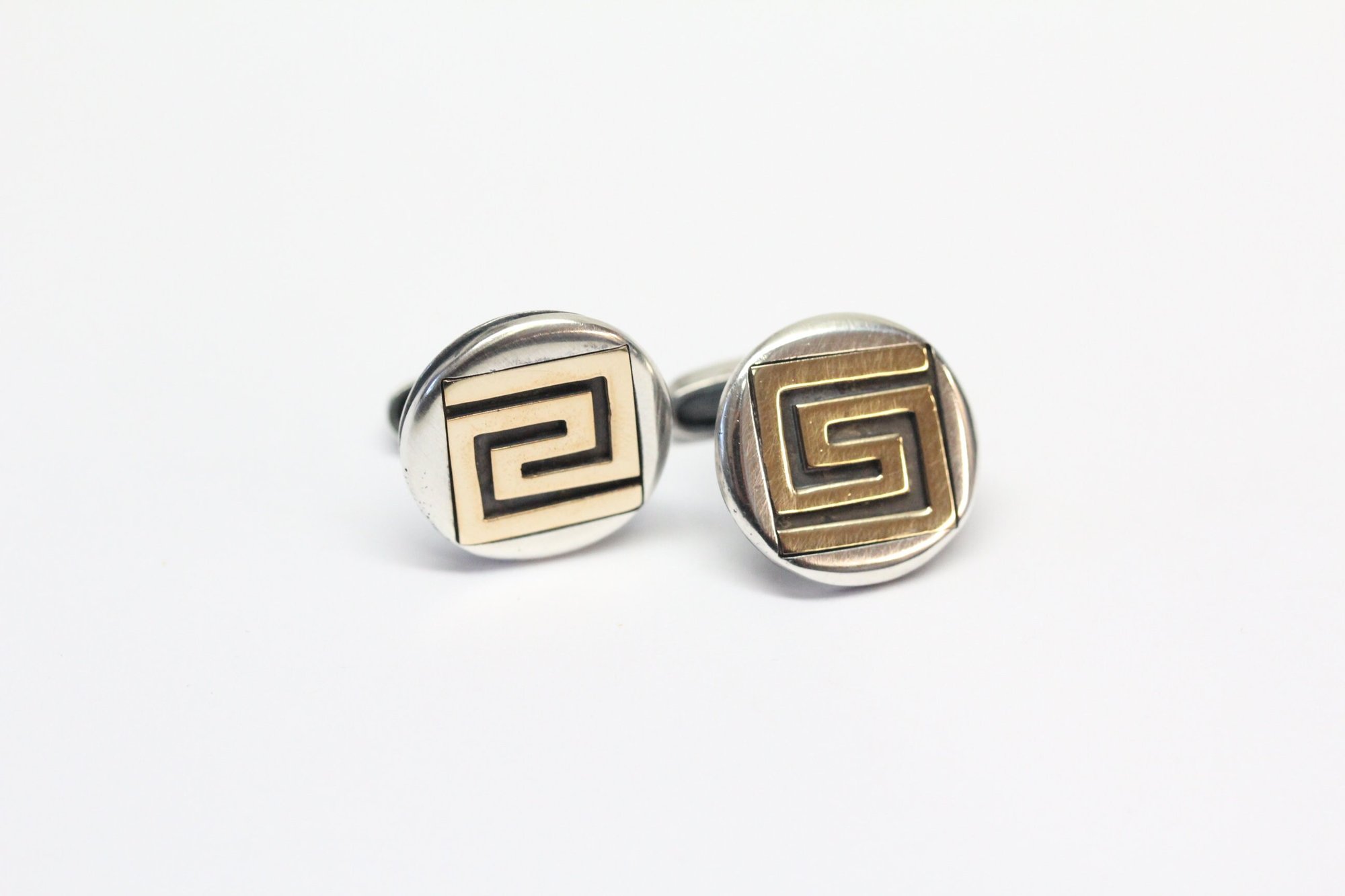 Original product name: Vintage Sterling Silver and 14k Yellow Gold Greek Key Cuff Links - Lovely Handmade Cufflinks - Lightly Refinished